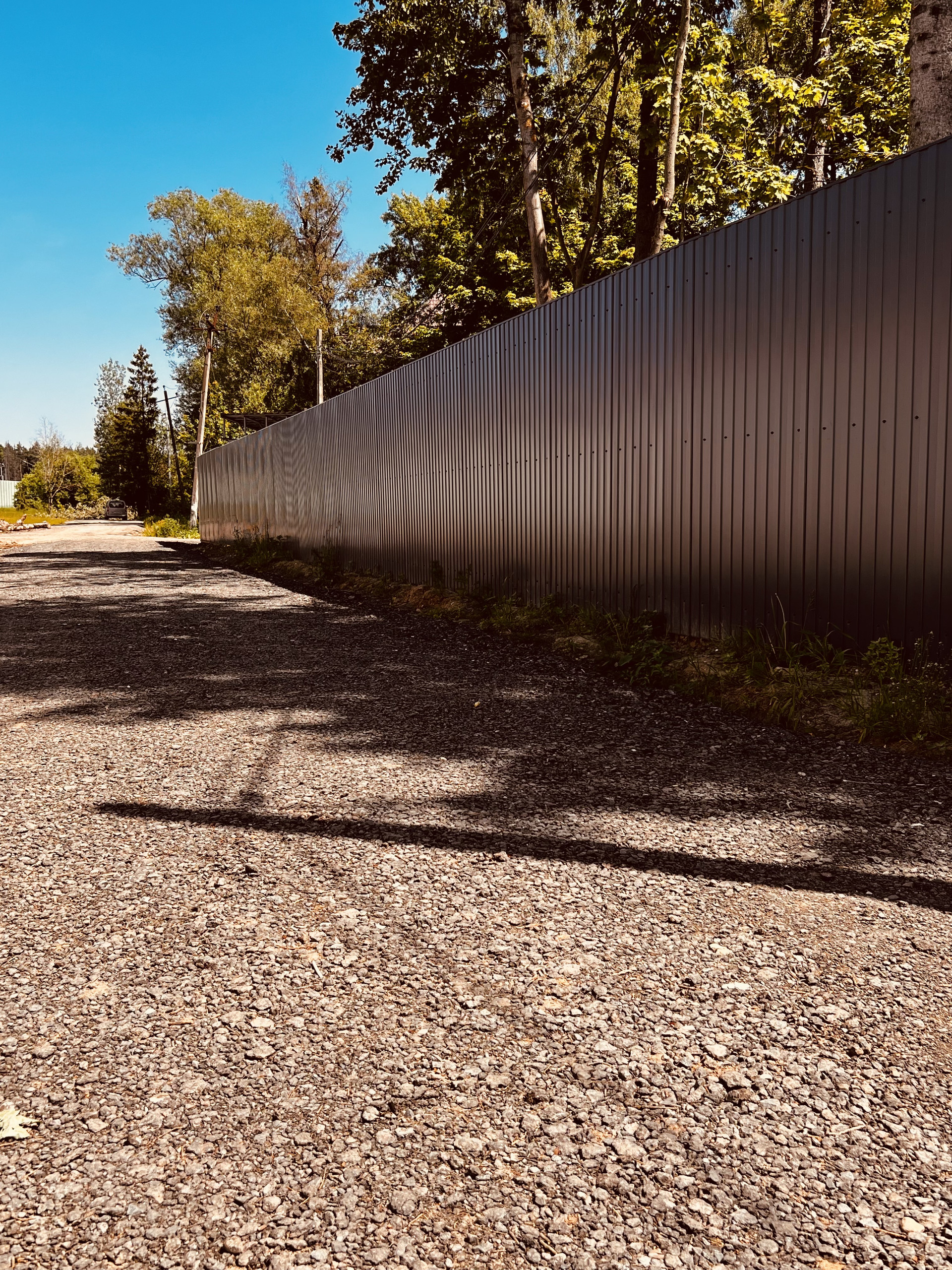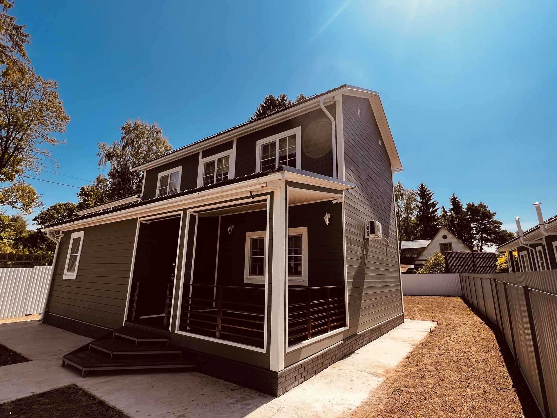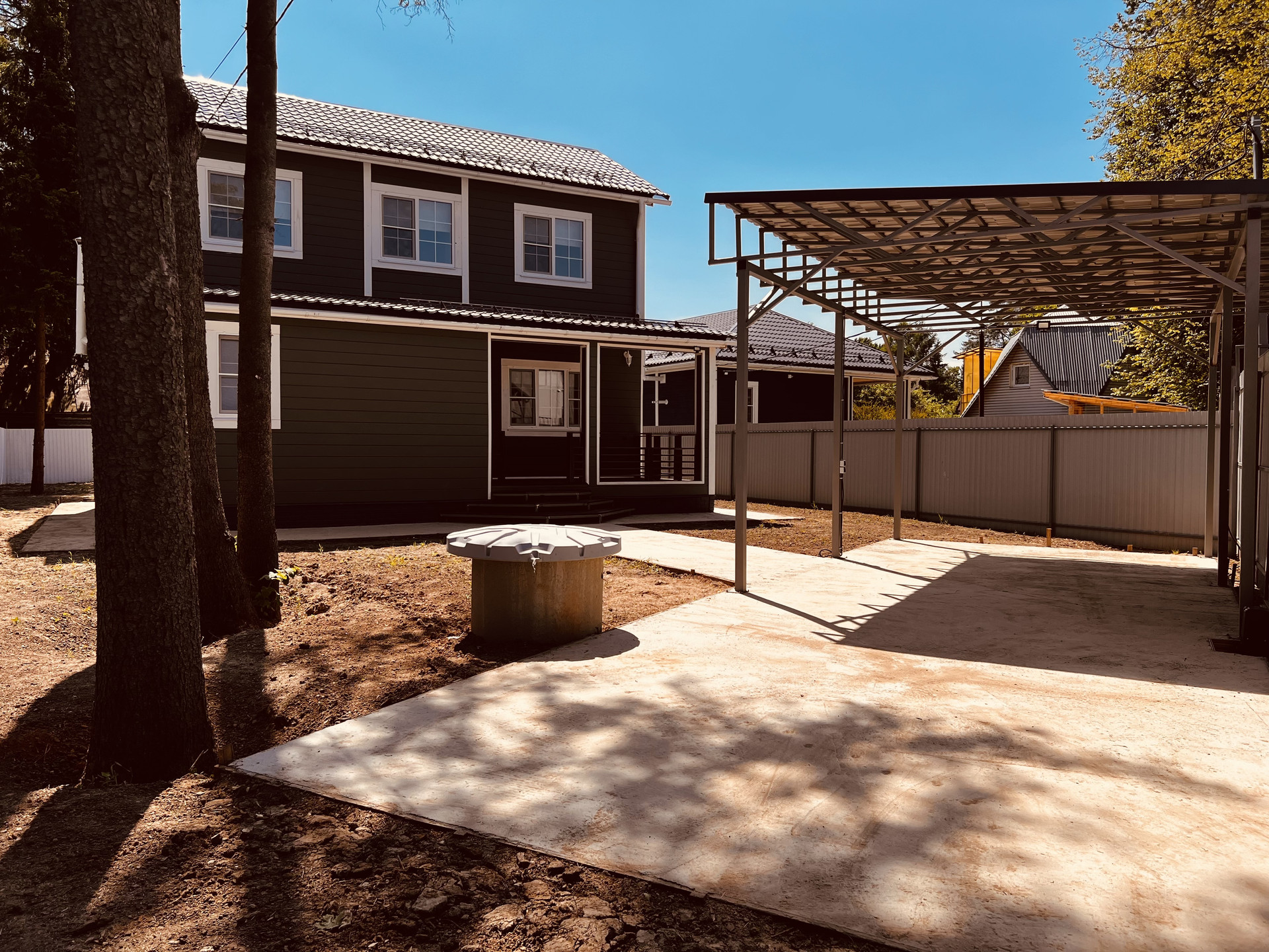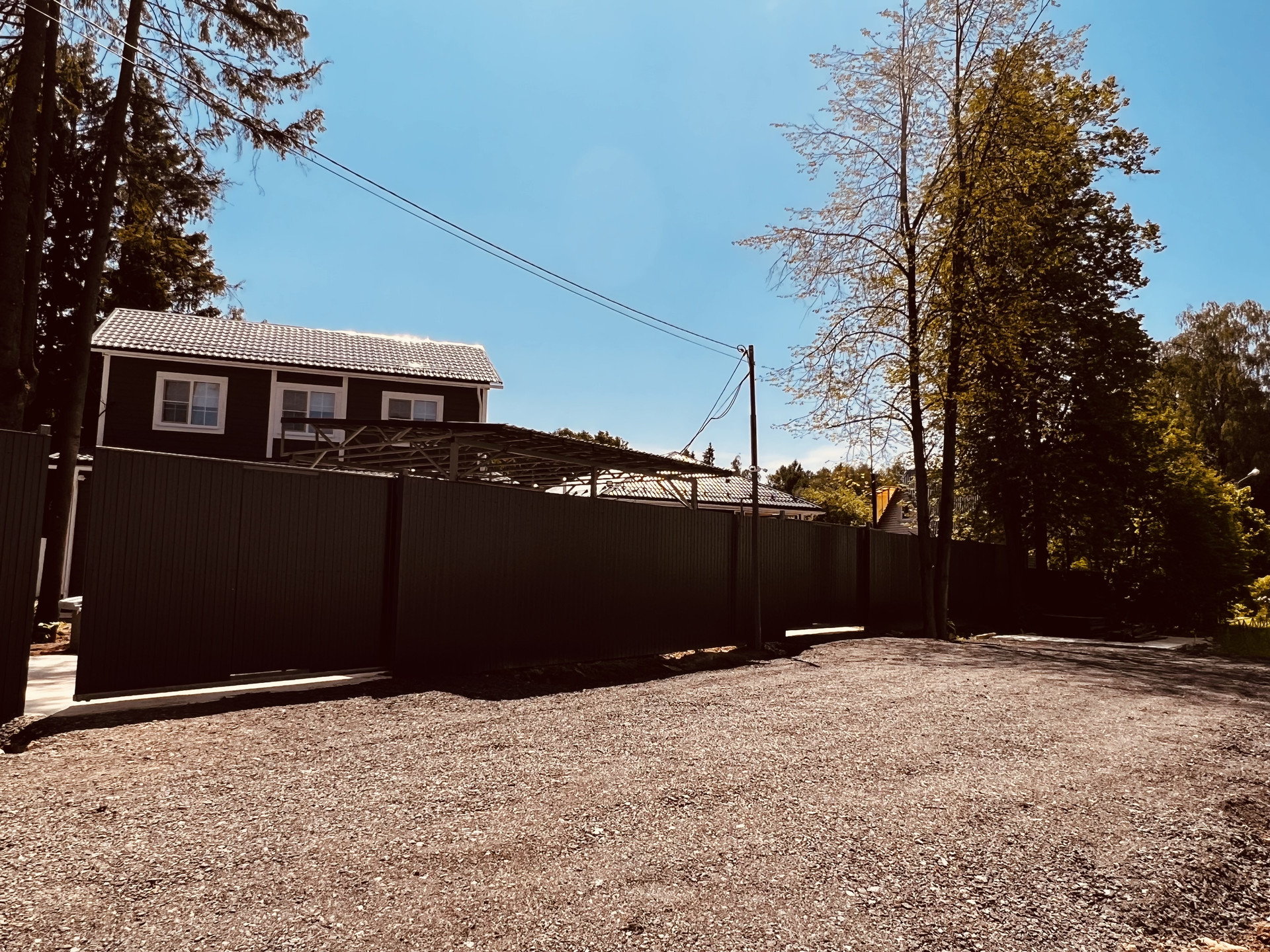 Участок огорожен забором, по территории видеонаблюдение, интернет, навес м/м, автоматические ворота. Парковочная площадка. На территории ели и деревья.