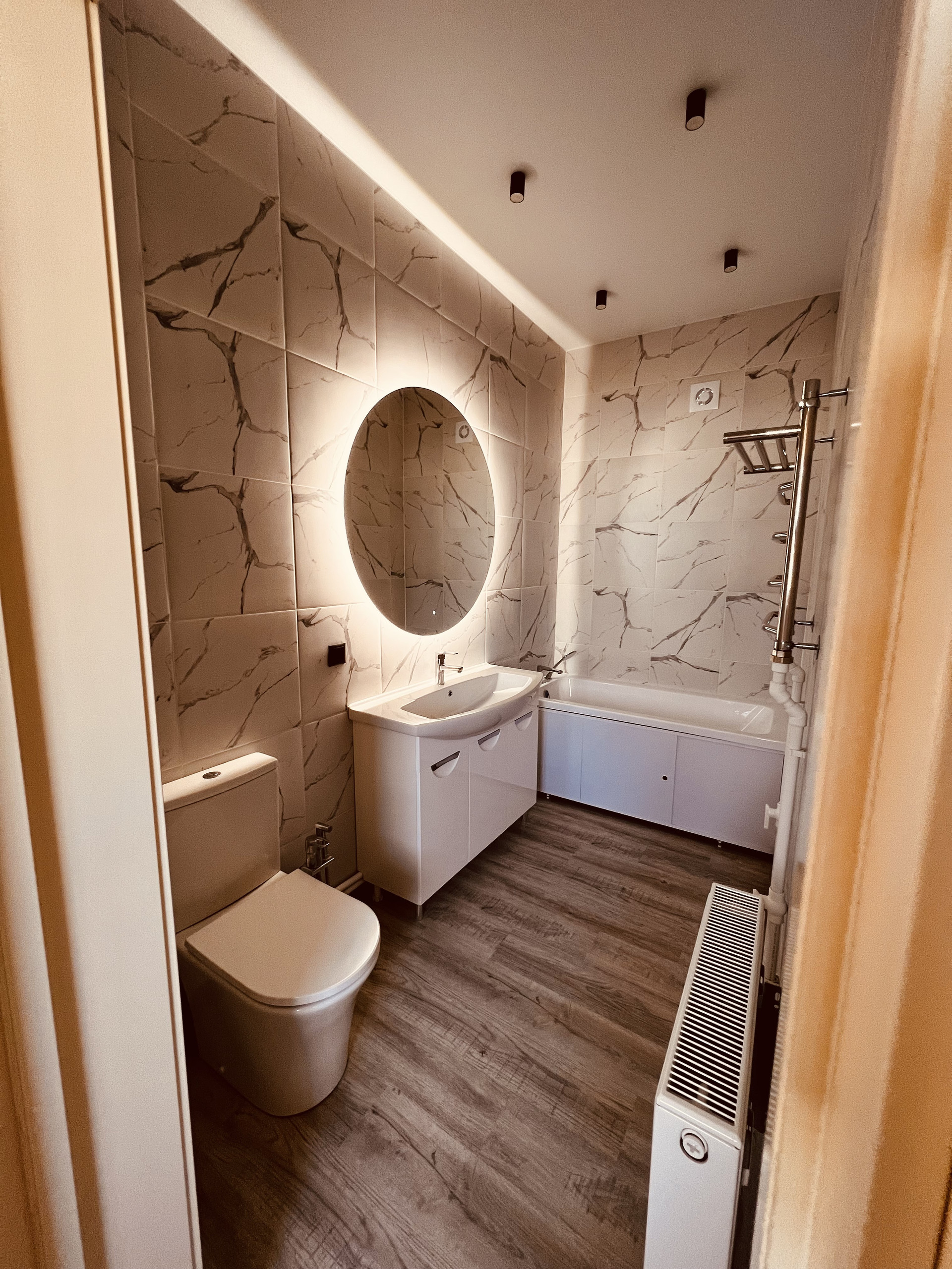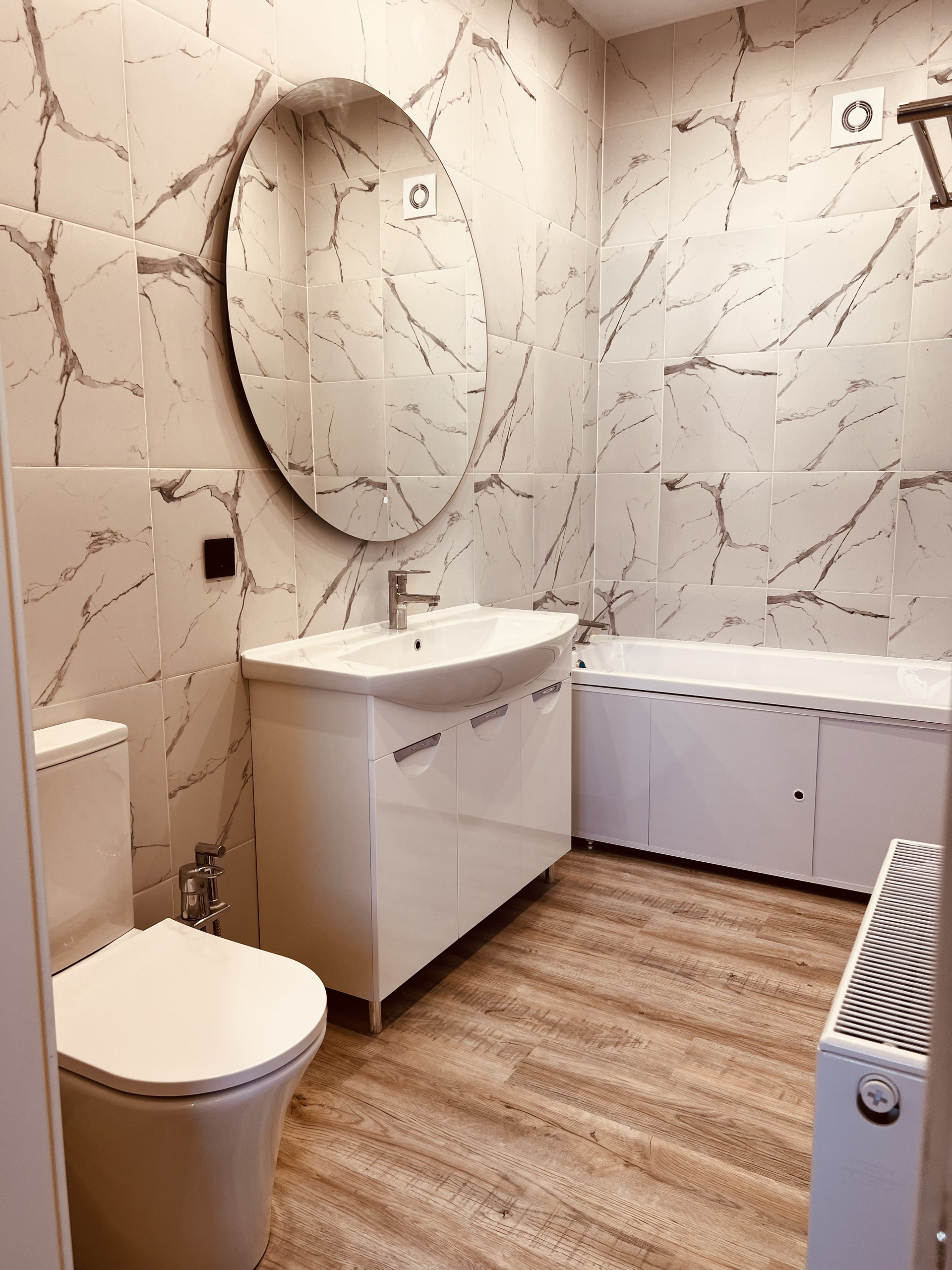 Потолки 3м, тройные стеклопакеты, кондиционер, теплые полы, установлены радиаторы отопления, сантехника.