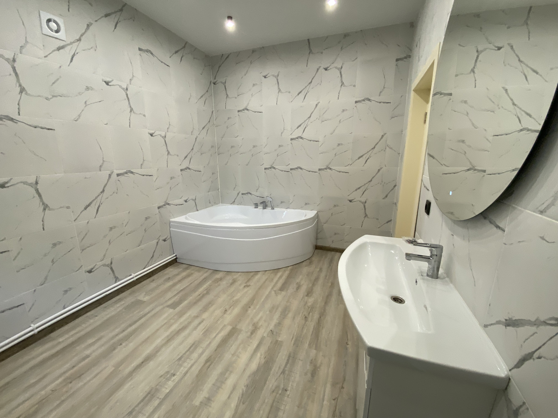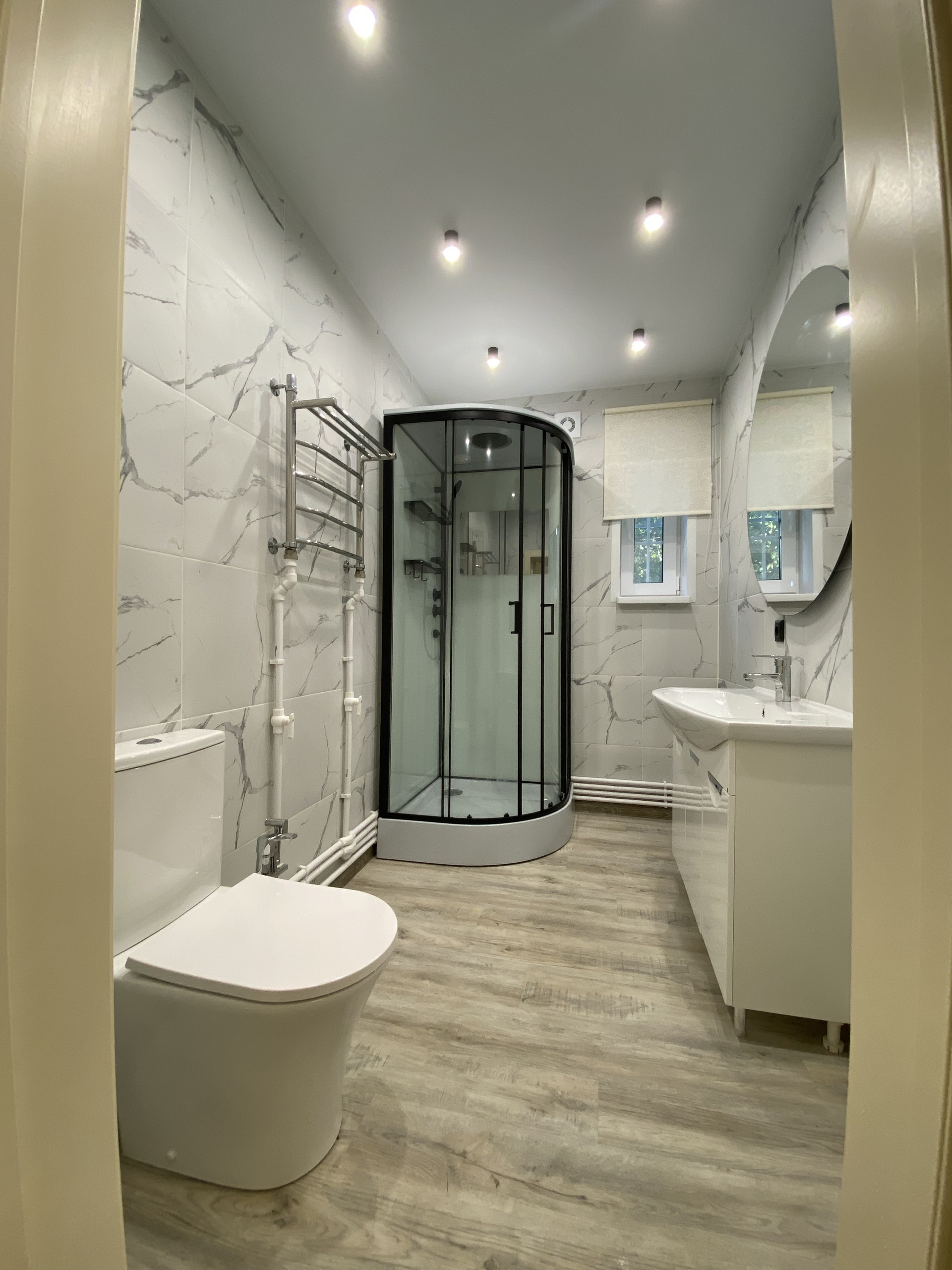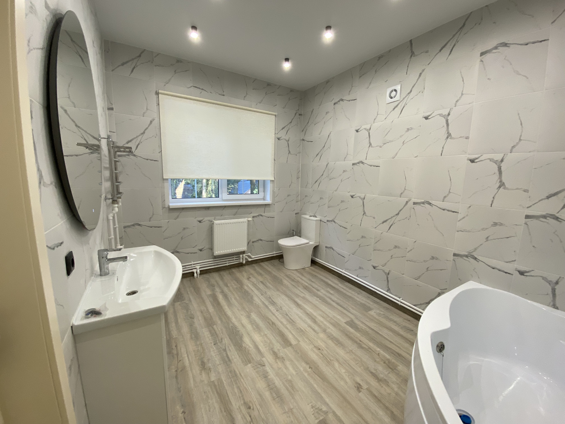 Потолки 3м, тройные стеклопакеты, теплые полы, кондиционер, установлены радиаторы отопления, сантехника.