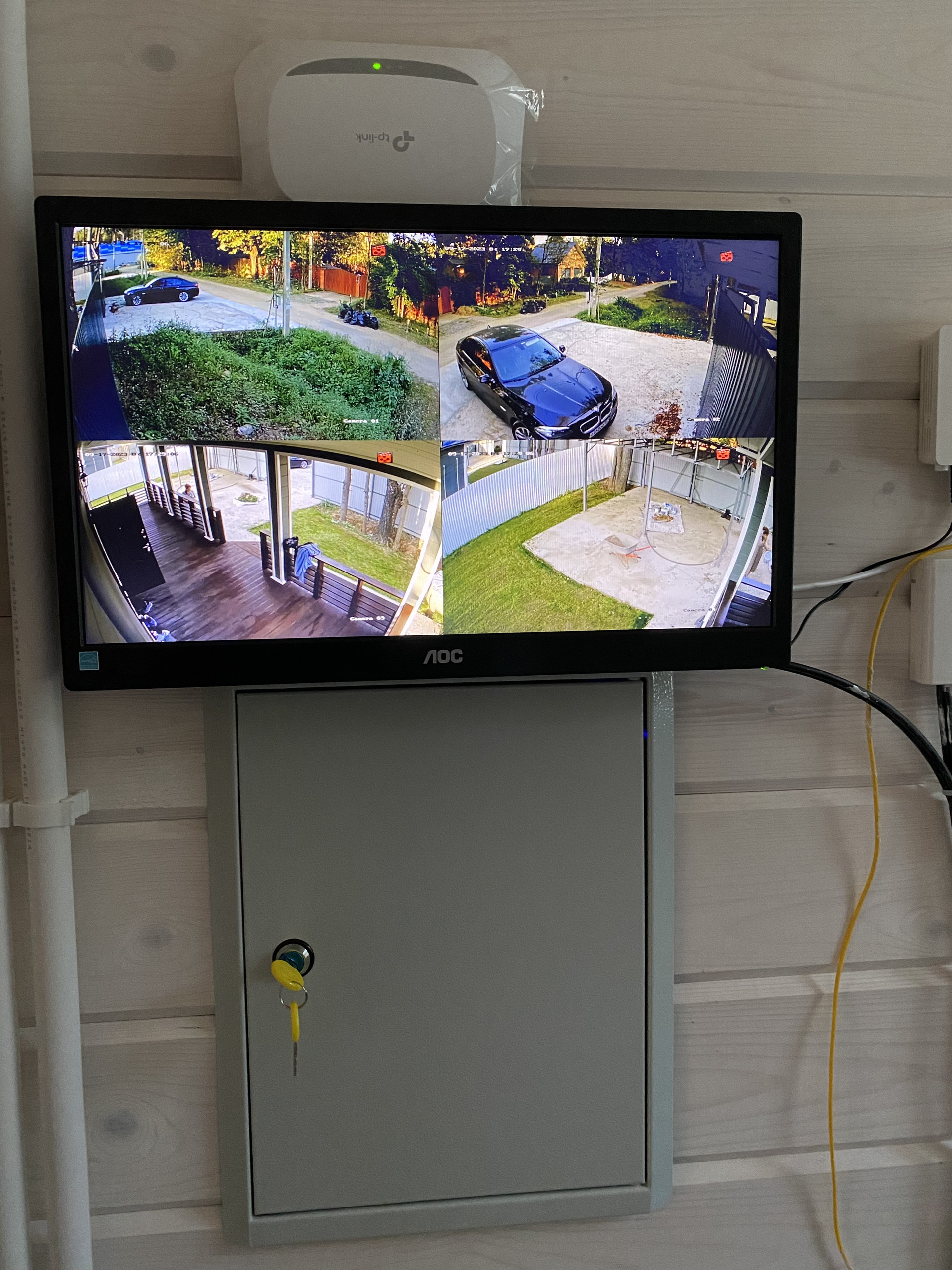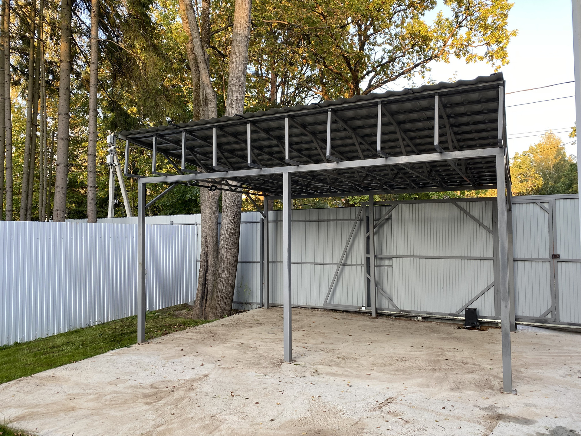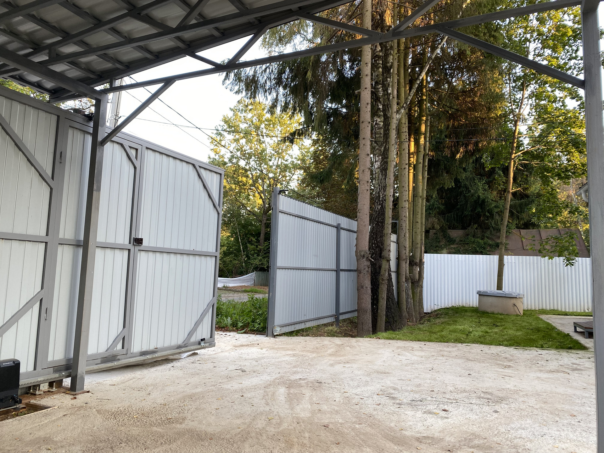 Участок огорожен забором, автоматические ворота, по территории видеонаблюдение, интернет, навес на 2 м/м, датчики движения.