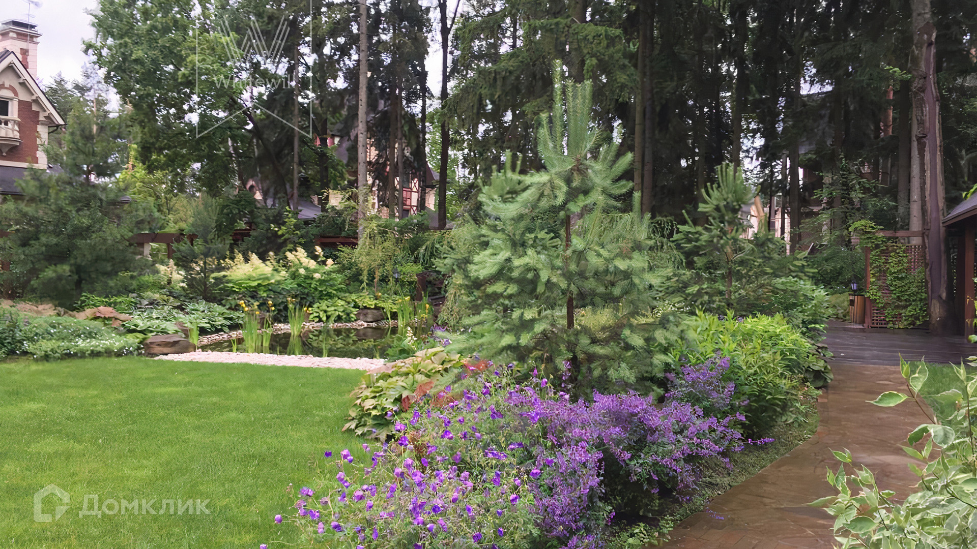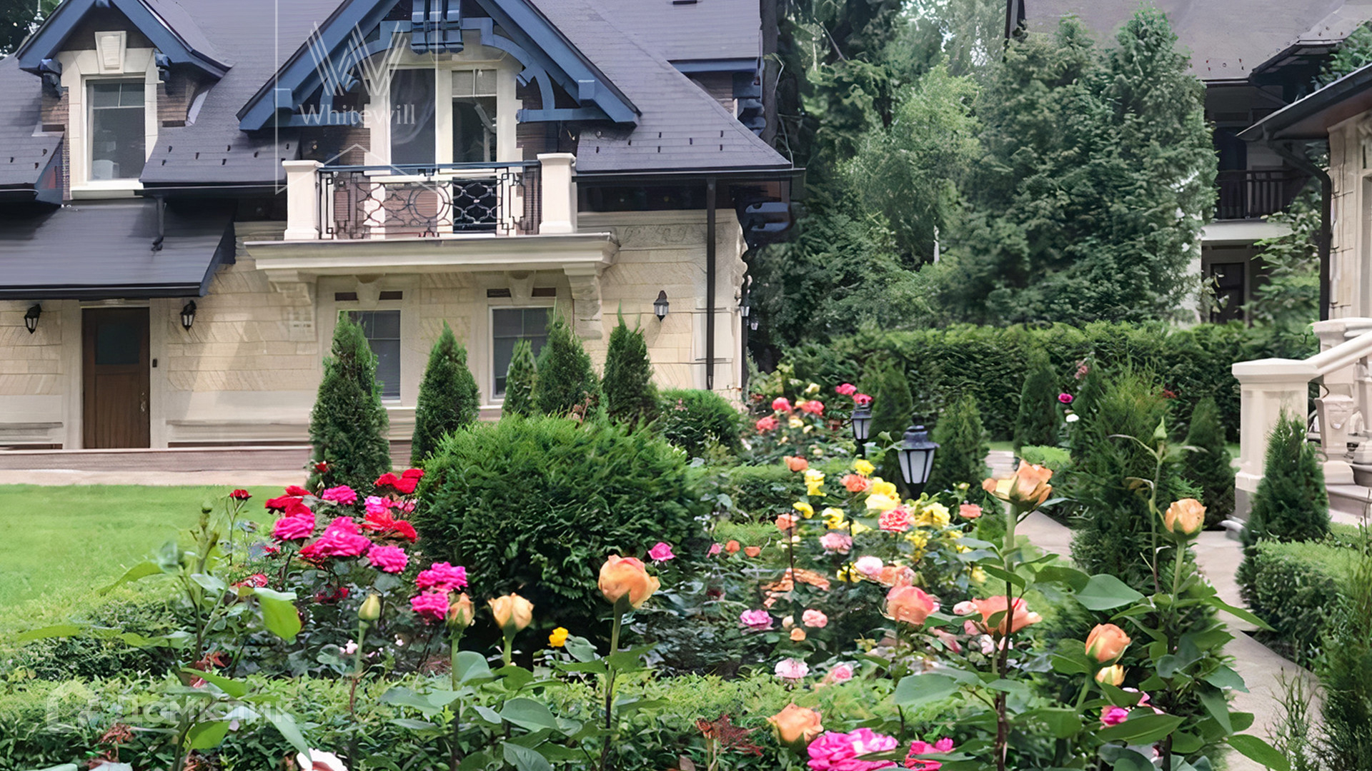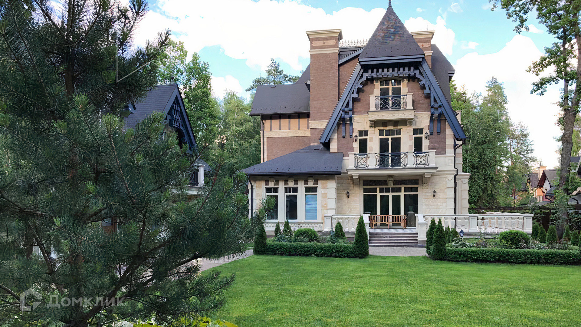 ID 5 510. Трувиль. Трёхэтажный дом в нормандском стиле предлагается с отделкой под ключ. Фасад украшен рустовкой, резными карнизами, наличниками и шпилями на крыше. Общая площадь дома — 400 м². Резиденция возведена на участке в 27 сотку с ландшафтным дизайном, газоном, цветниками и своим прудом. На участке построен отдельный гараж 154 м² на 2 машины с квартирой для персонала.