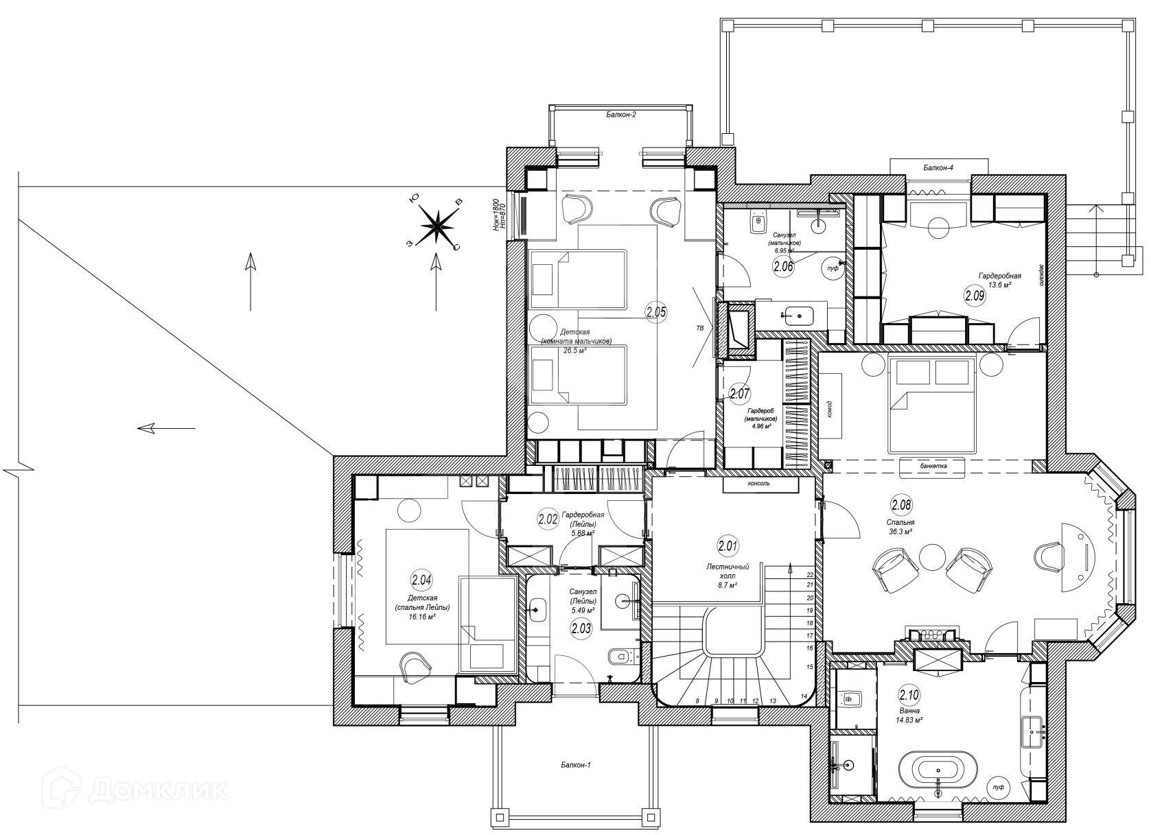 2 этаж: мастер-спальня с с\у и гардеробной, 2 спальни с с\у и гардеробными.