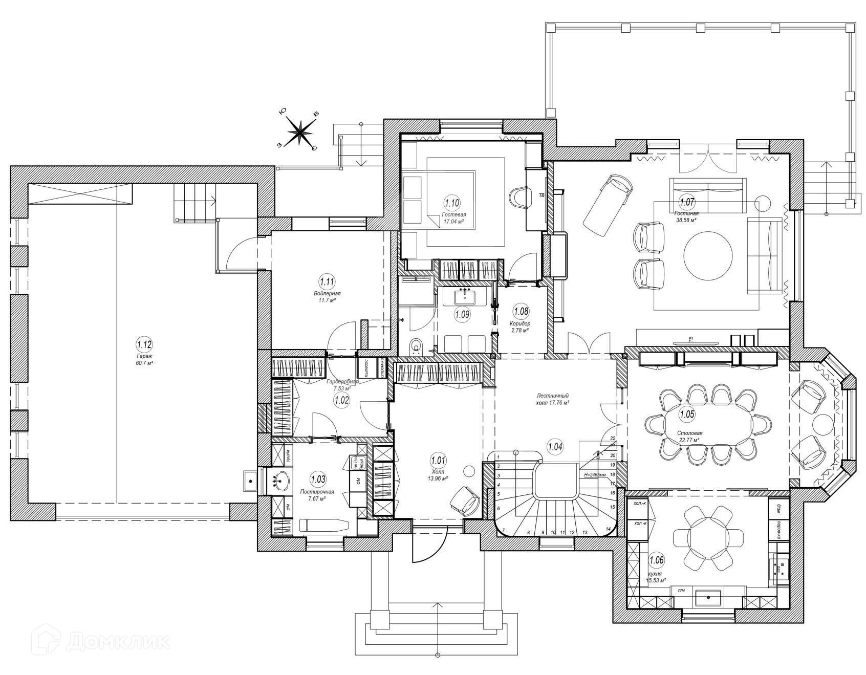 1 этаж: холл, гостиная, столовая, кухня, гостевая спальня с с\у, гардероб, постирочная, гараж на 2 м/м, бойлерная.