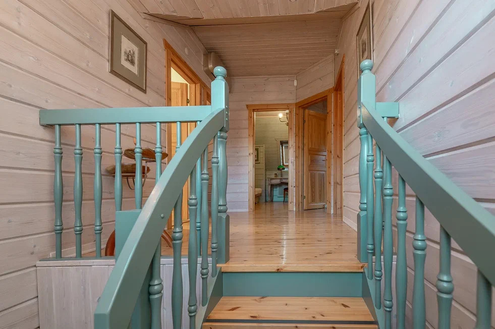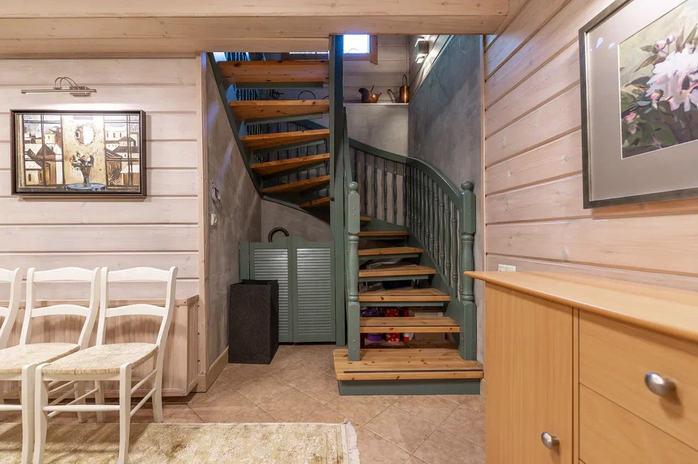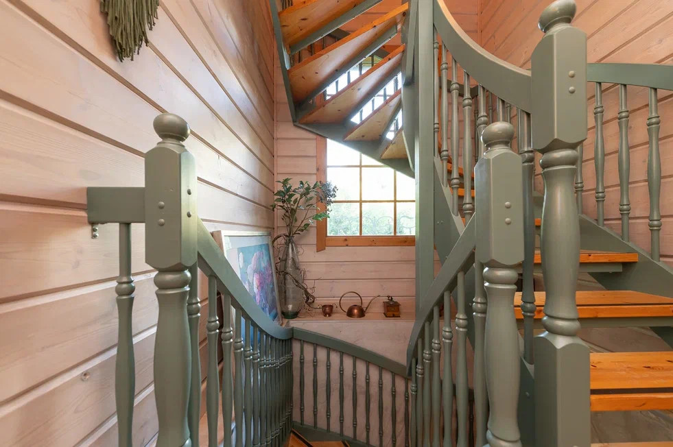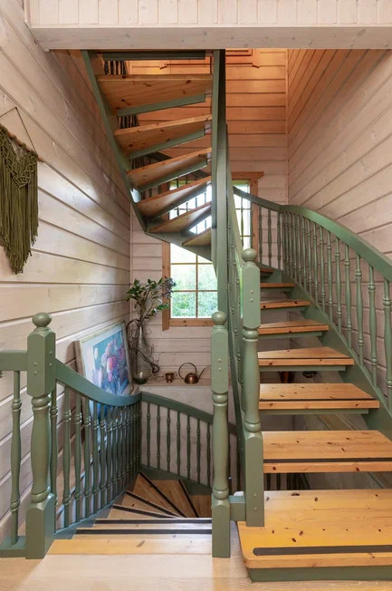 Между тремя этажами установлена красивая винтовая деревянная лестница.
