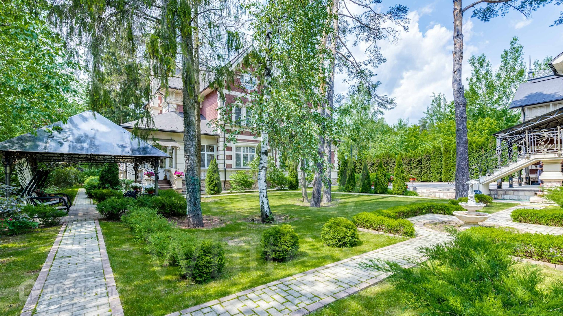 На участке расположен дом для персонала с гаражом в едином стиле с главной резиденцией. Лесной участок засеян газоном, дорожки вымощены плиткой, установлен фонтан.