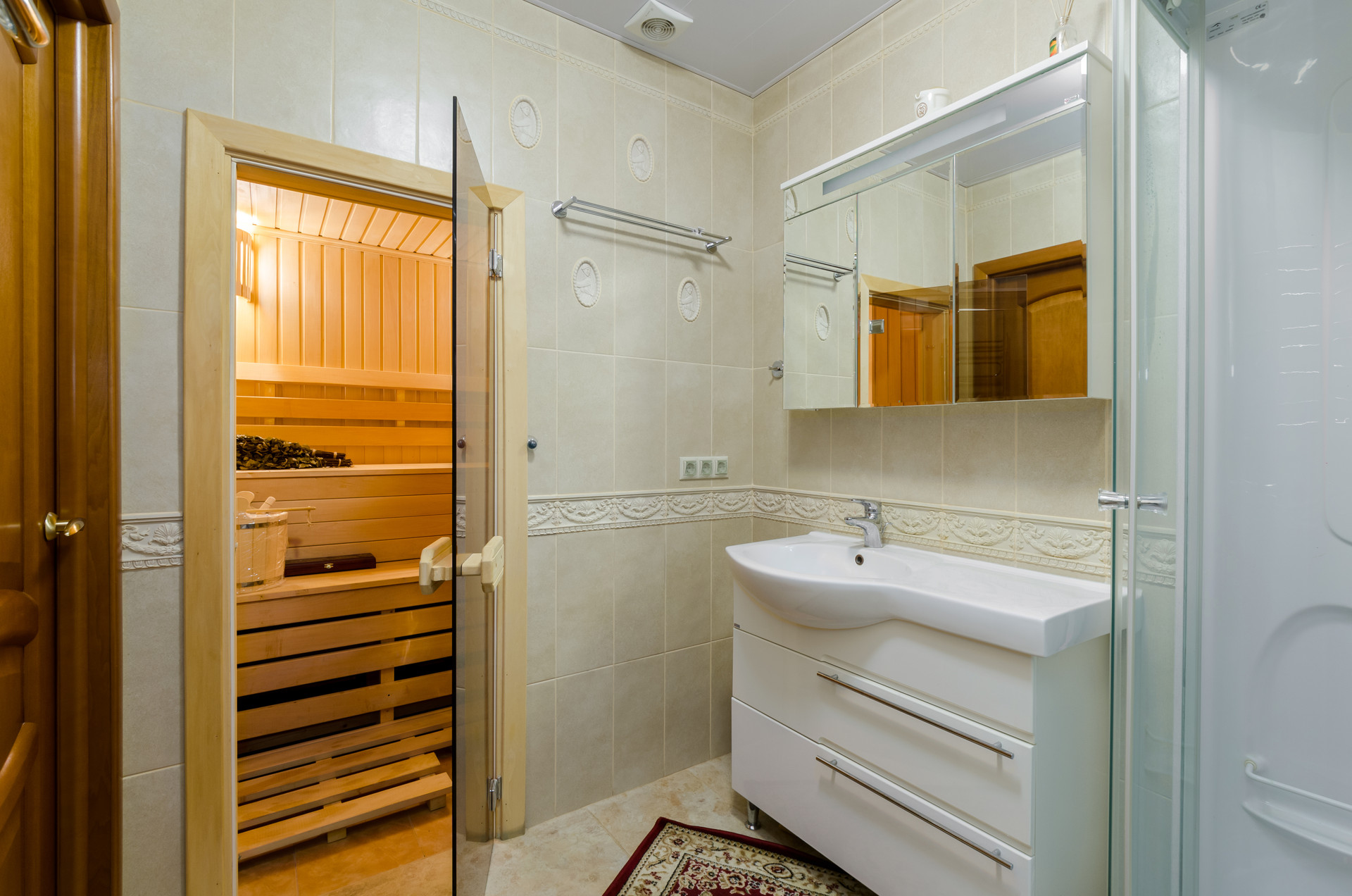 1-й этаж: прихожая со шкафом-купе, хоз комната, санузел, сауна, кухня, гостиная с камином, выход на патио, с двух сторон от патио расположены две кладовые для хоз нужд.