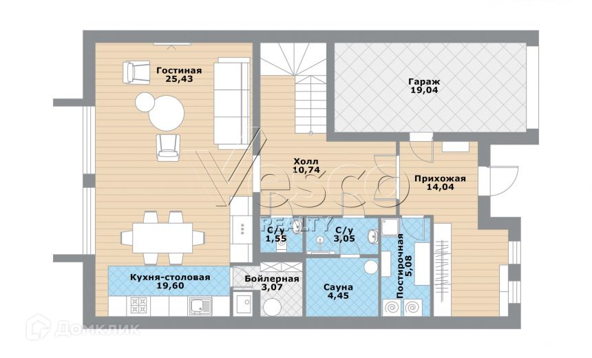 1 этаж: просторная гостиная с видом на участок (25), кухня-столовая (20), сауна (4) с с/у (3), гостевой с/у (2), постирочная с помывочной для животных (5), холл (11), прихожая (14), спальня (19).