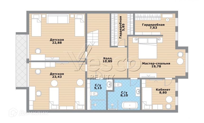 2 этаж: мастер-спальня (20) с собственным кабинетом (9), с/у (8) и гардеробной (8), детская спальня №1 (23), детская спальня №2 (23), общий с/у (5), холл (11) с гардеробной (6).