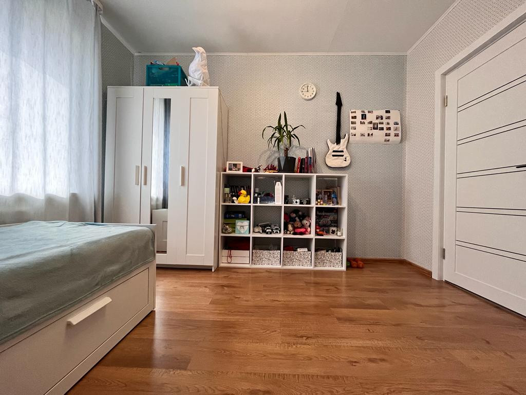 В доме ремонт: на полу ламинат, в комнатах кроме спален натяжные потолки, в санузле водяной теплый пол, сделан свежий ремонт: на стенах керамическая плитка, на полу - керамогранит, установлена новая сантехника. В доме новые межкомнатные двери.