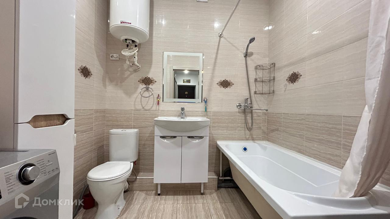 санузле установлены унитаз, ваннная, раковина, водонагреватель