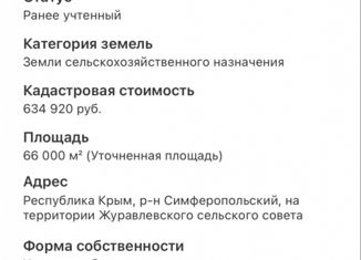 В продаже 6,6 га на территории Симферопольского района, Журавлевского с/с. Кадастровый номер участка 90:12:000000:5924 . Назначение земли сельхоз использование. |