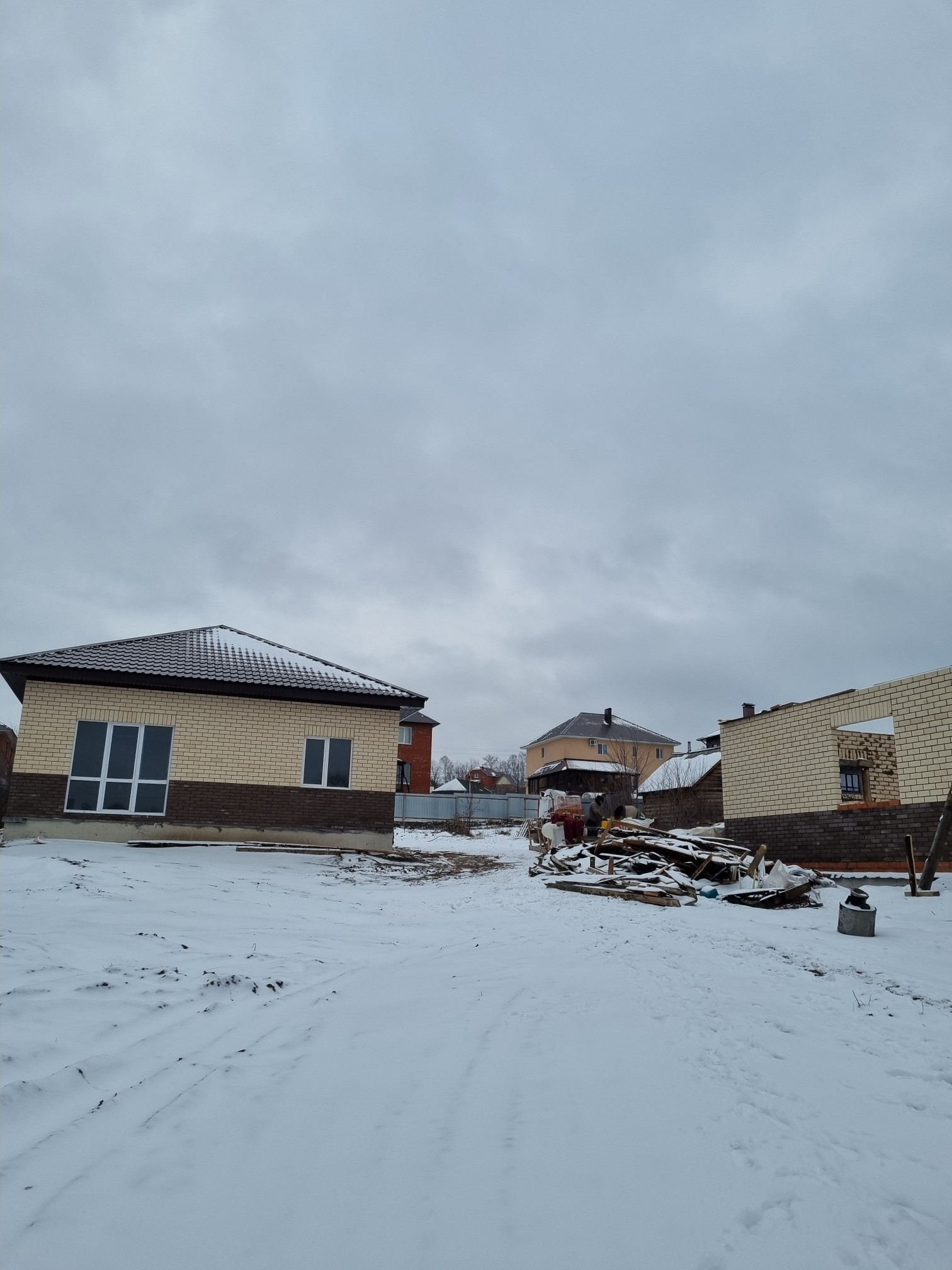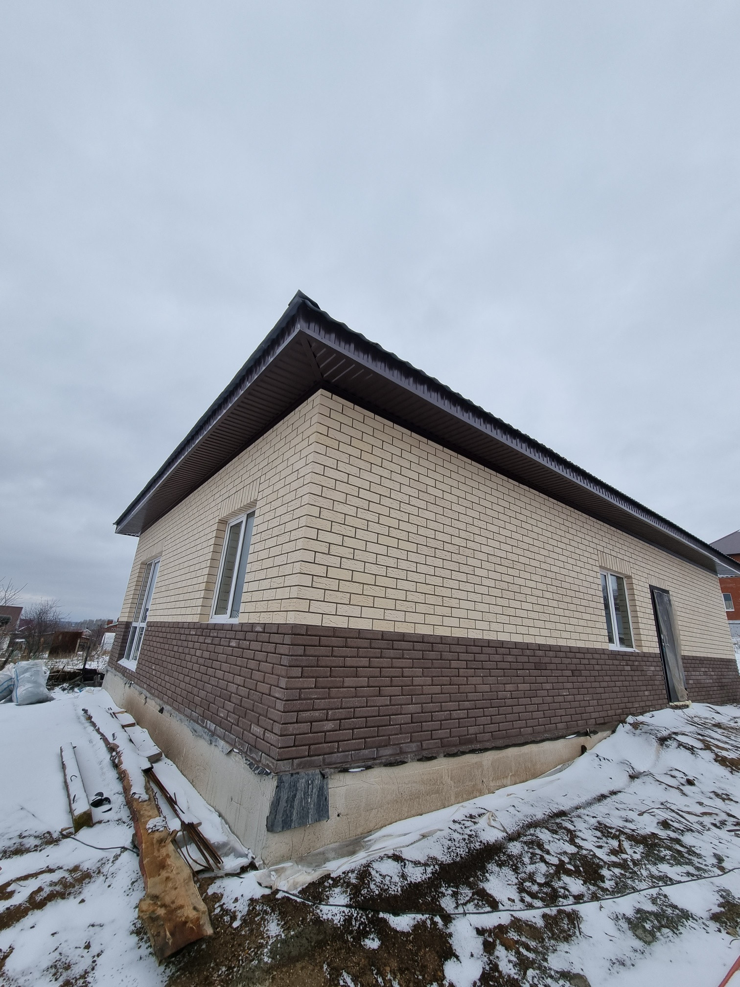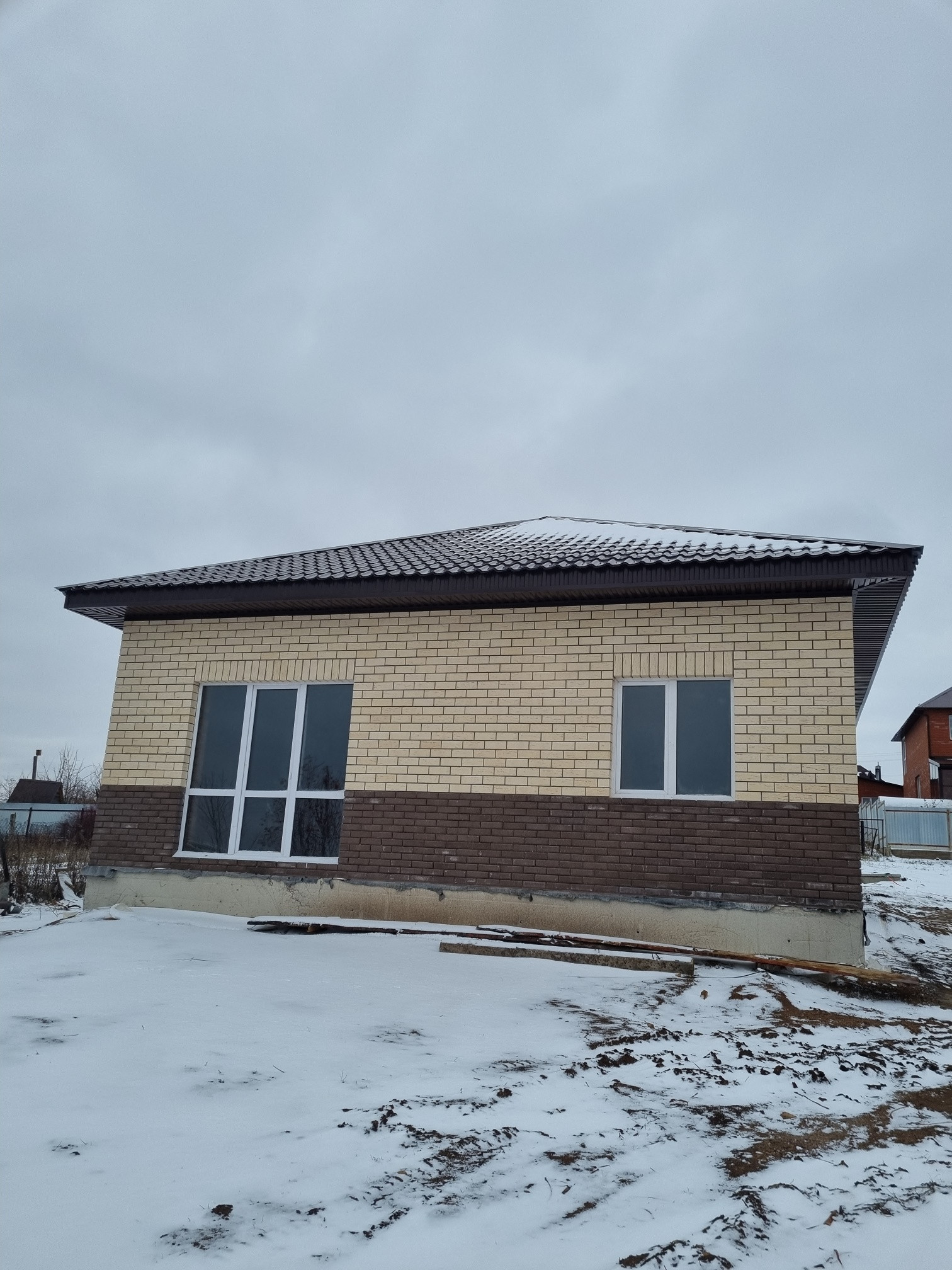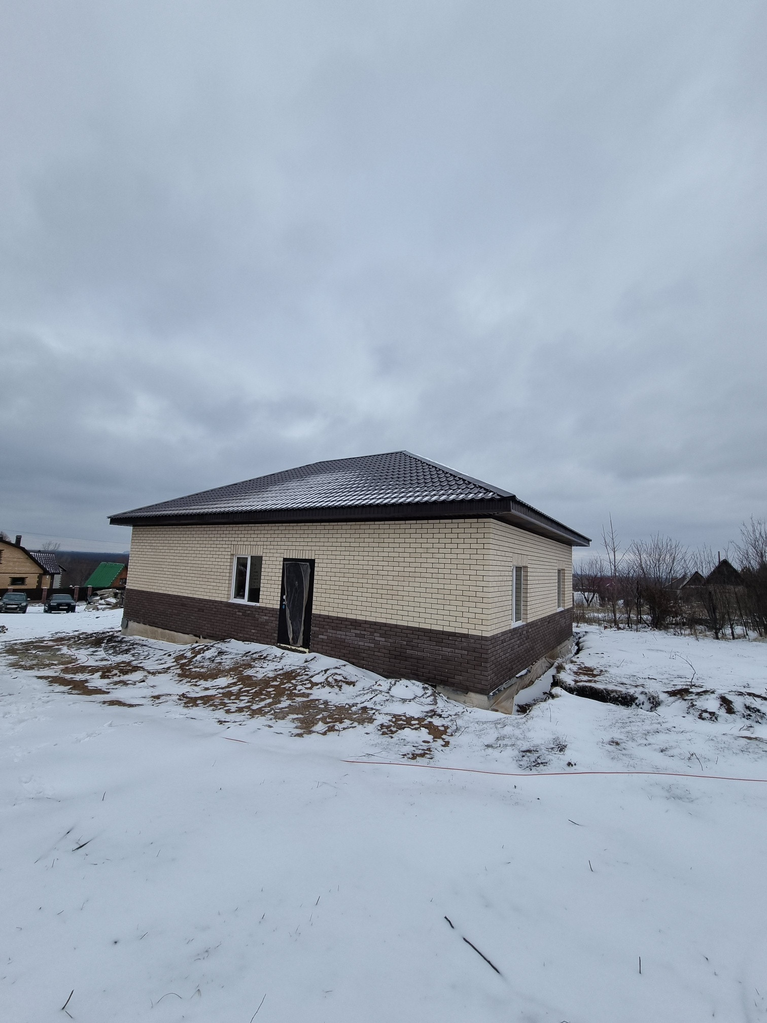 Крыша четырехскатная металлочерепица. Установлены радиаторы, проведен теплый пол.