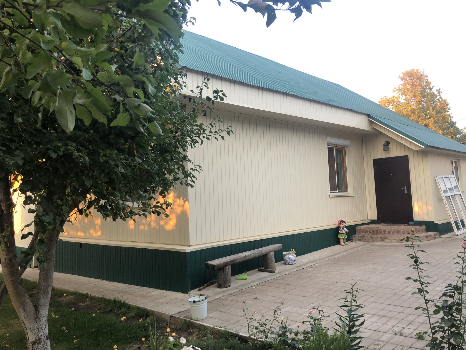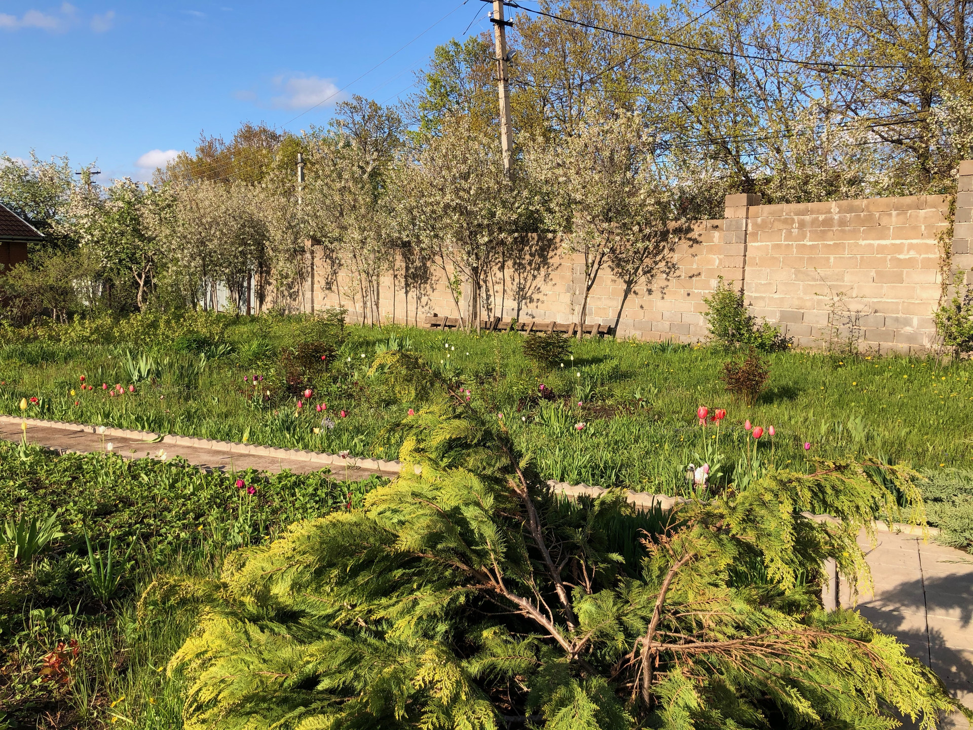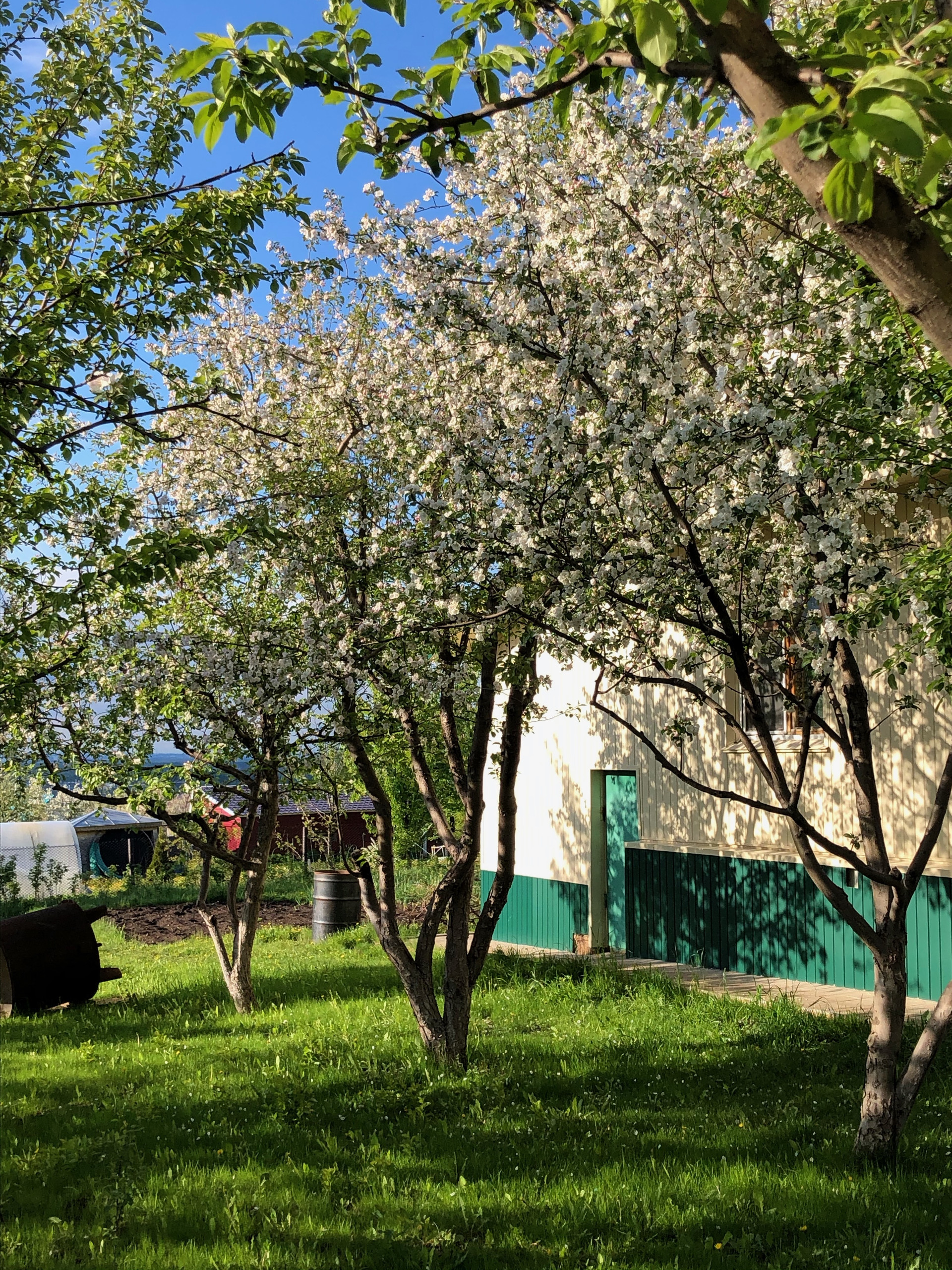 На участке построены под одной крышей гараж 5 х 6,5 (ворота с электроприводом); баня 6 х 5 с финской печью Harvia, водопроводом и теплым полом (в бане и предбаннике); хозблок 8 х 5. Имеется фундамент под теплицу размером 9 х 3. На участке растут плодоносящие деревья: яблони, груши, вишня. сливы черная и желтая, калина, малина, смородина, крыжовник, жимолость, виноград, йошта и декоративные кустарники, и многолетние цветы: розы, пионы, нарциссы, тюльпаны и др..