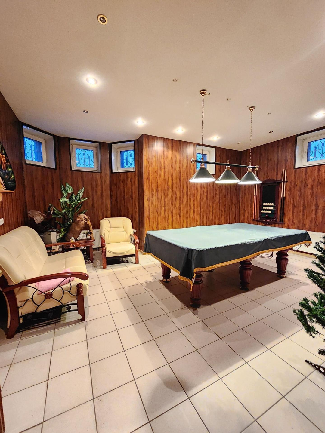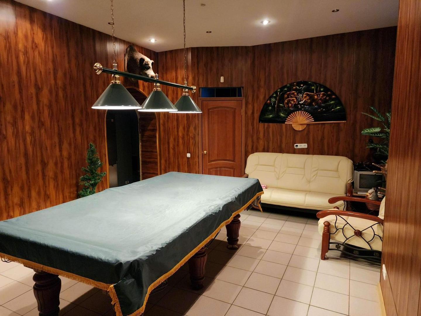 -Цокольный этаж: сауна- 3,7 м², бассейн- 21,5 м², бильярд- 25 м², помещение для продуктов и зимних заготовок- 7,4 м², душевая/санузел- 3,6 м², котельная- 12,2 м², холл свободного назначения- 10,2 и 5,3 м².