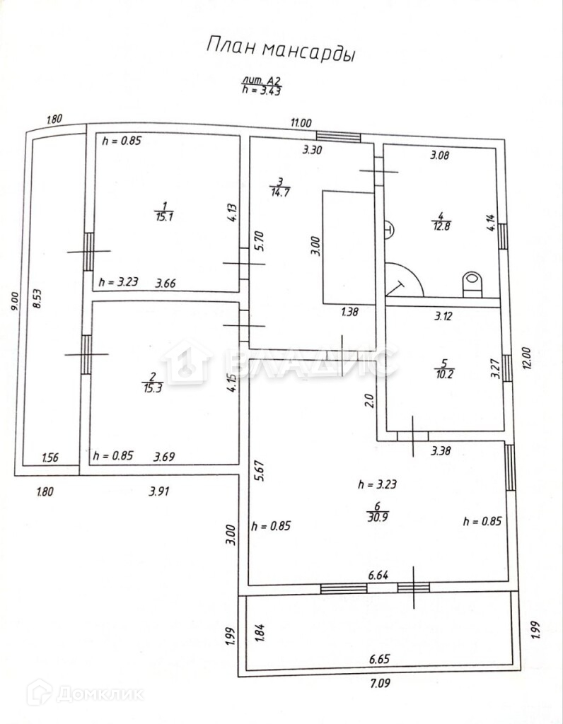 2-й мансардный этаж - большая спальня 30,9 кв.м, детская комната 10,2 кв.м,