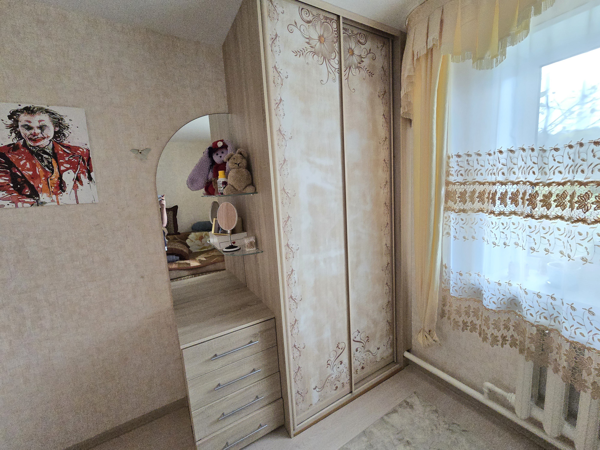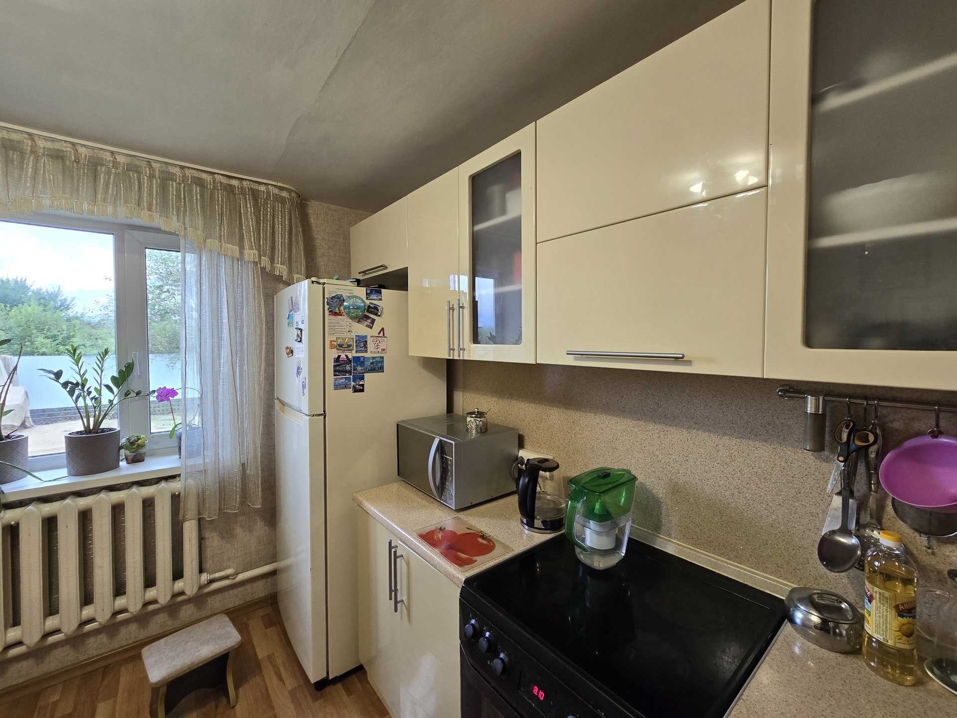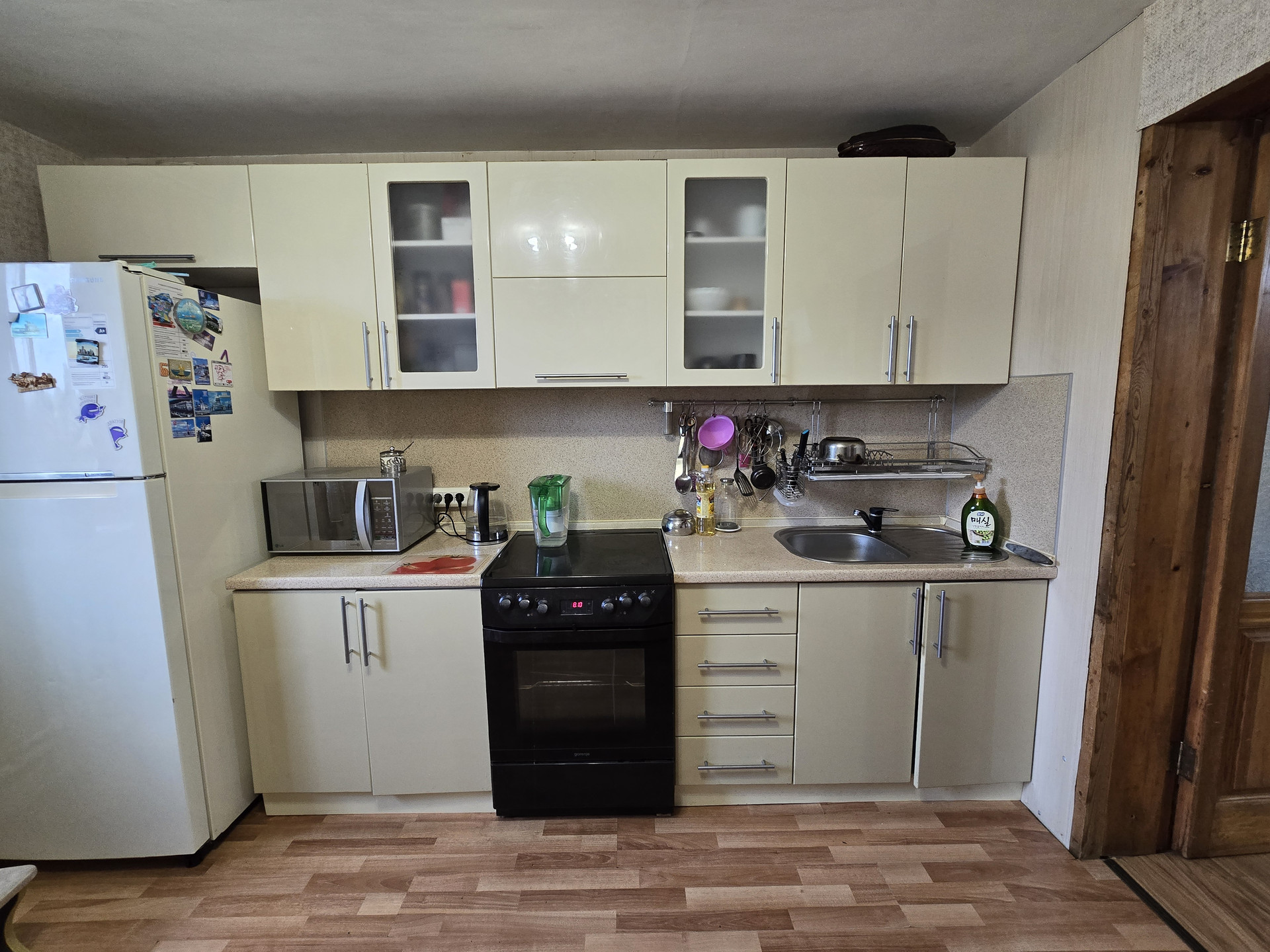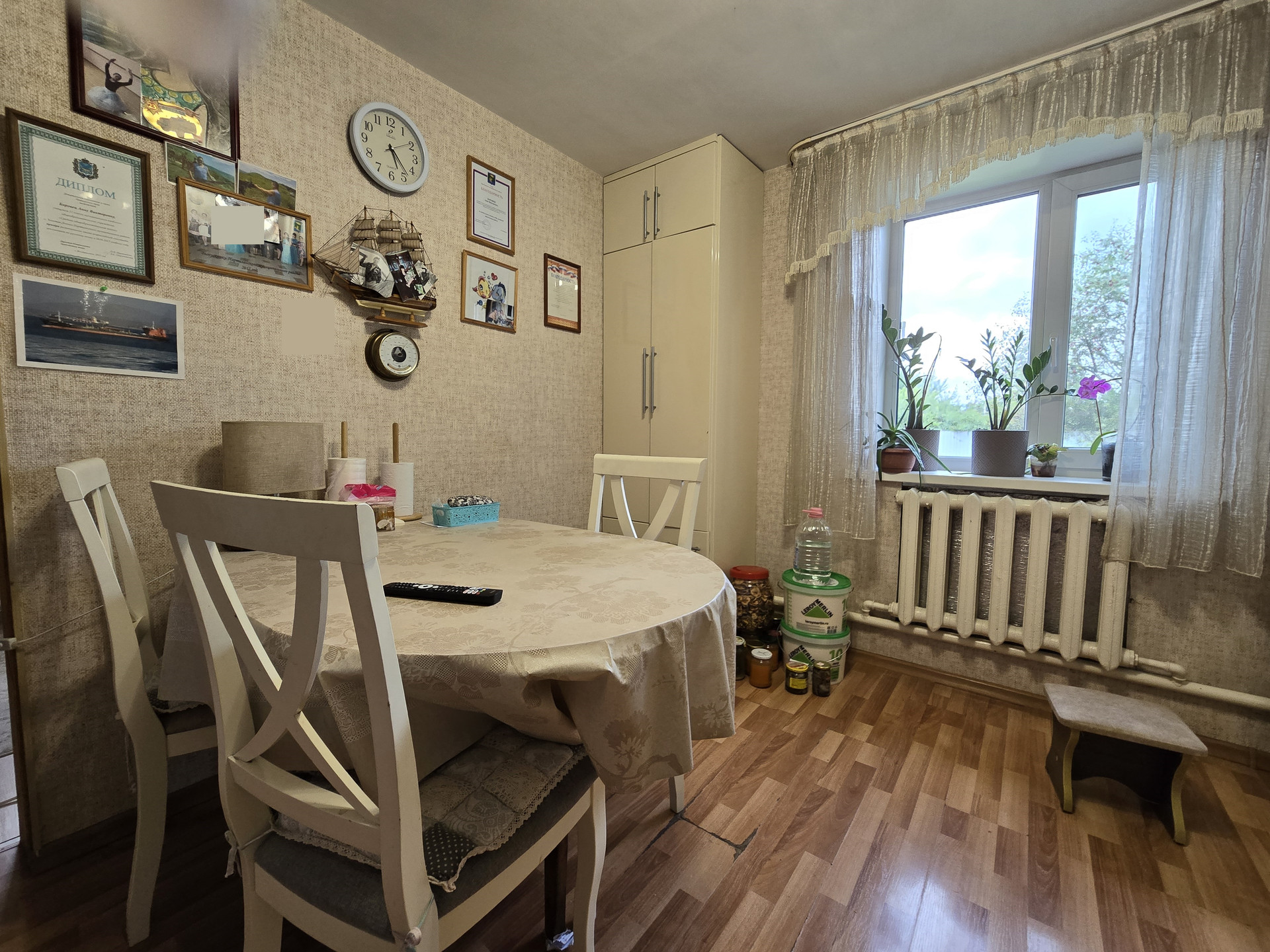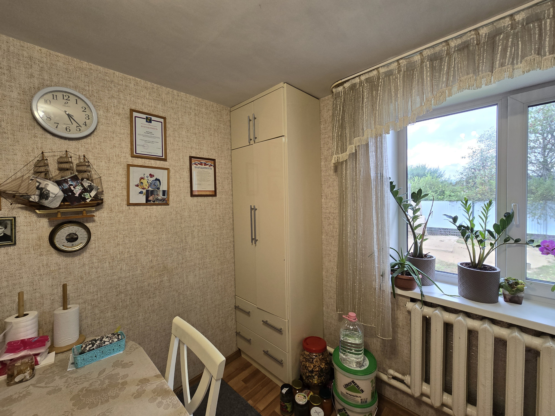 Остается отличная встроенная мебель - кухонный гарнитур, шкафы-купе, стол.