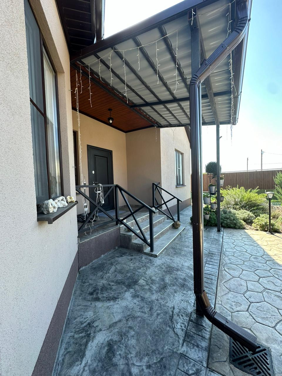 В доме два входа:выход на заднюю часть участка через крытую веранду