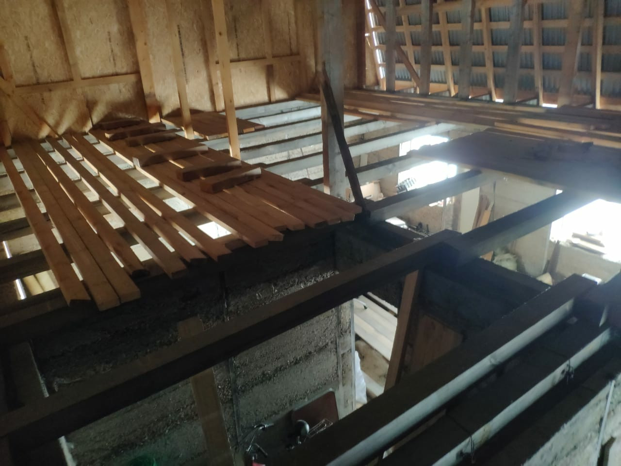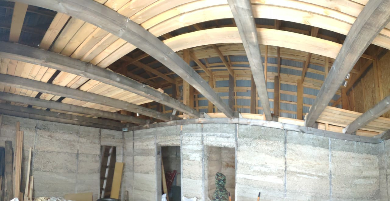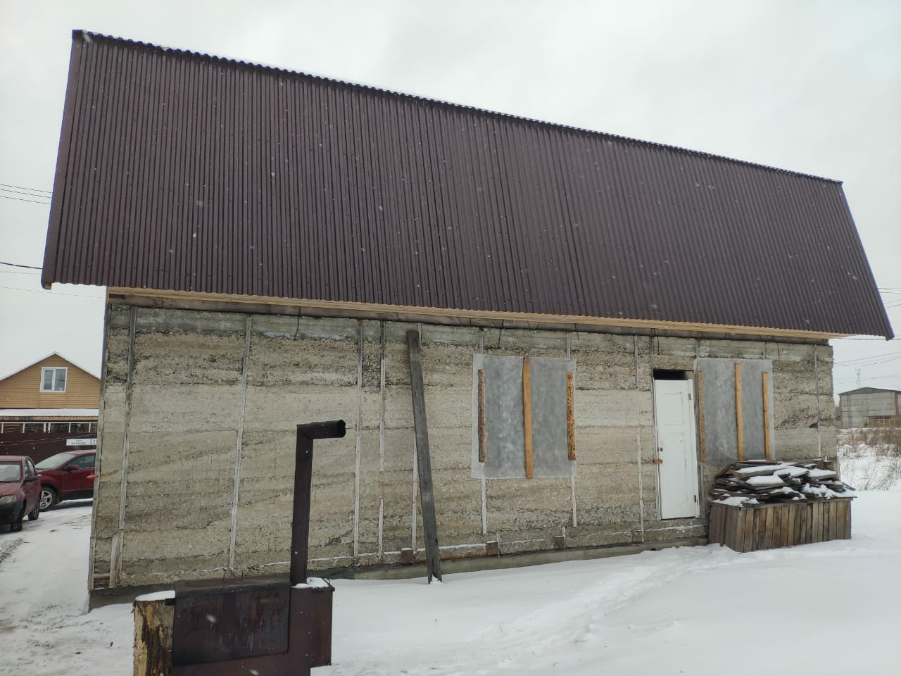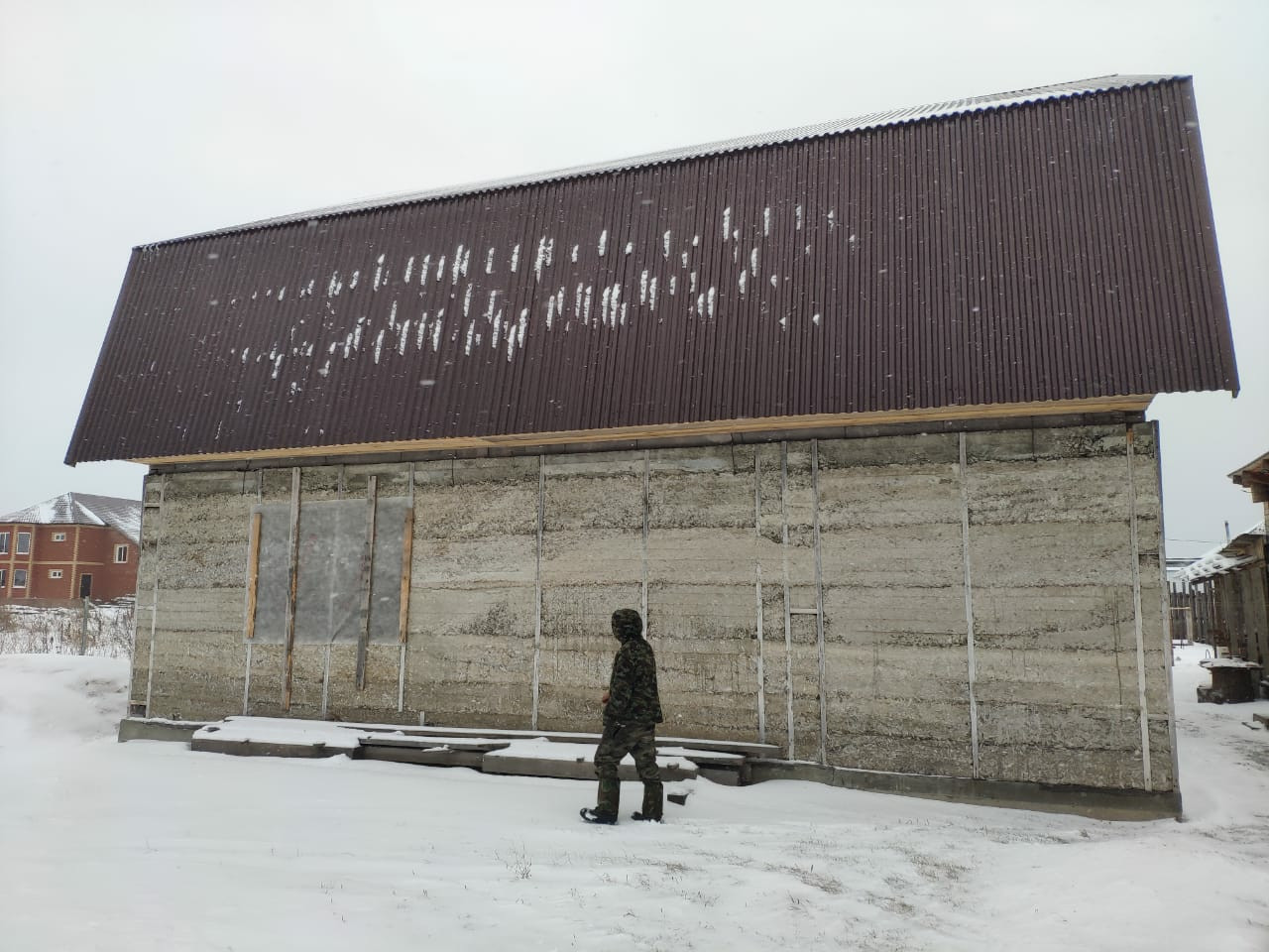 - 2 этажный дом 11*8м (176 м.кв.), ленточный фундамент, материал стен – арболит (очень теплый материал), толщина стен – 35 см., готовая кровля (металлопрофиль). Дом подходит для круглогодичного проживания. Состав комнат 1 этажа: гостиная (40 м.кв.), кухня (24 м.кв), ванная комната (9 м.кв.), кательная + постирочная (20 м.кв.), 2 этаж – свободная планировка.