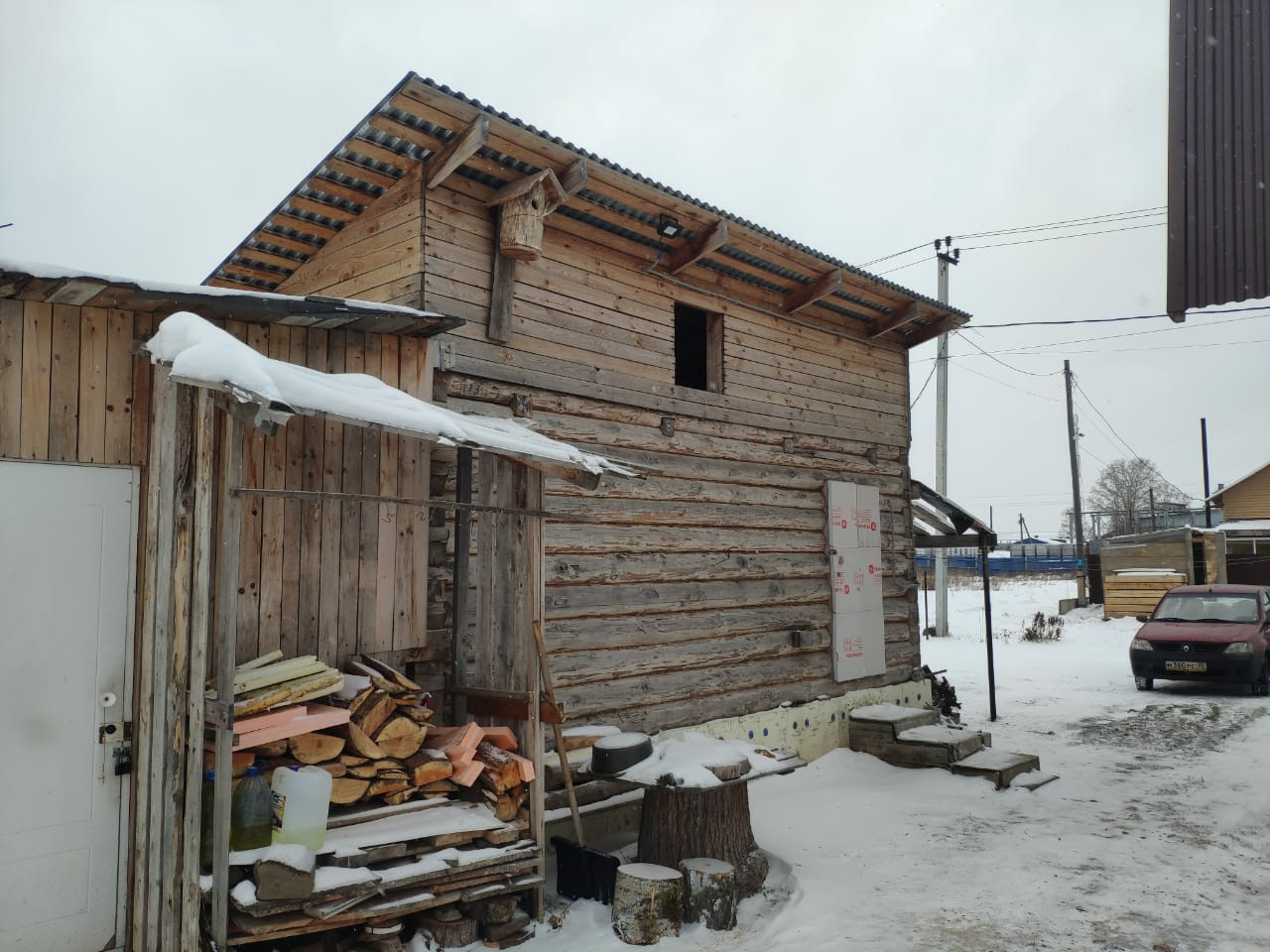 - рубленный сруб 6*4 (24м.кв.), задумывался под баню, на данный момент используется для временного проживания.