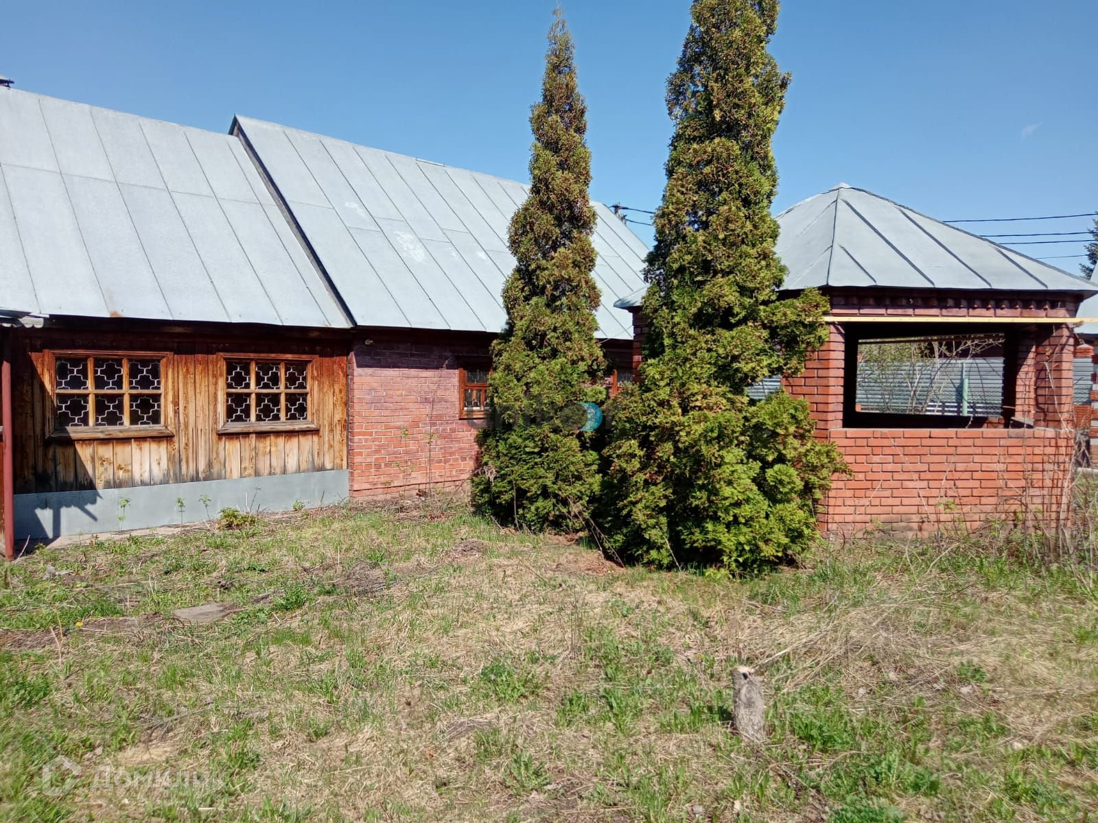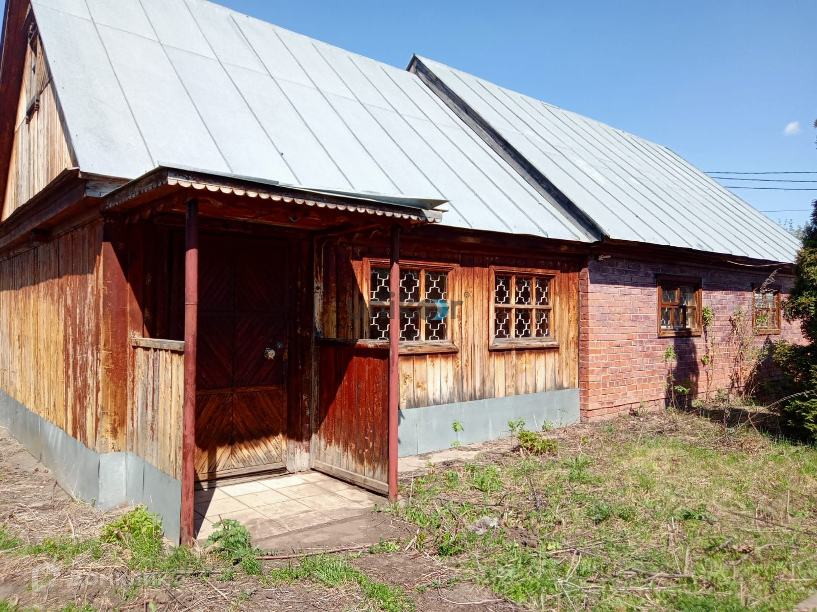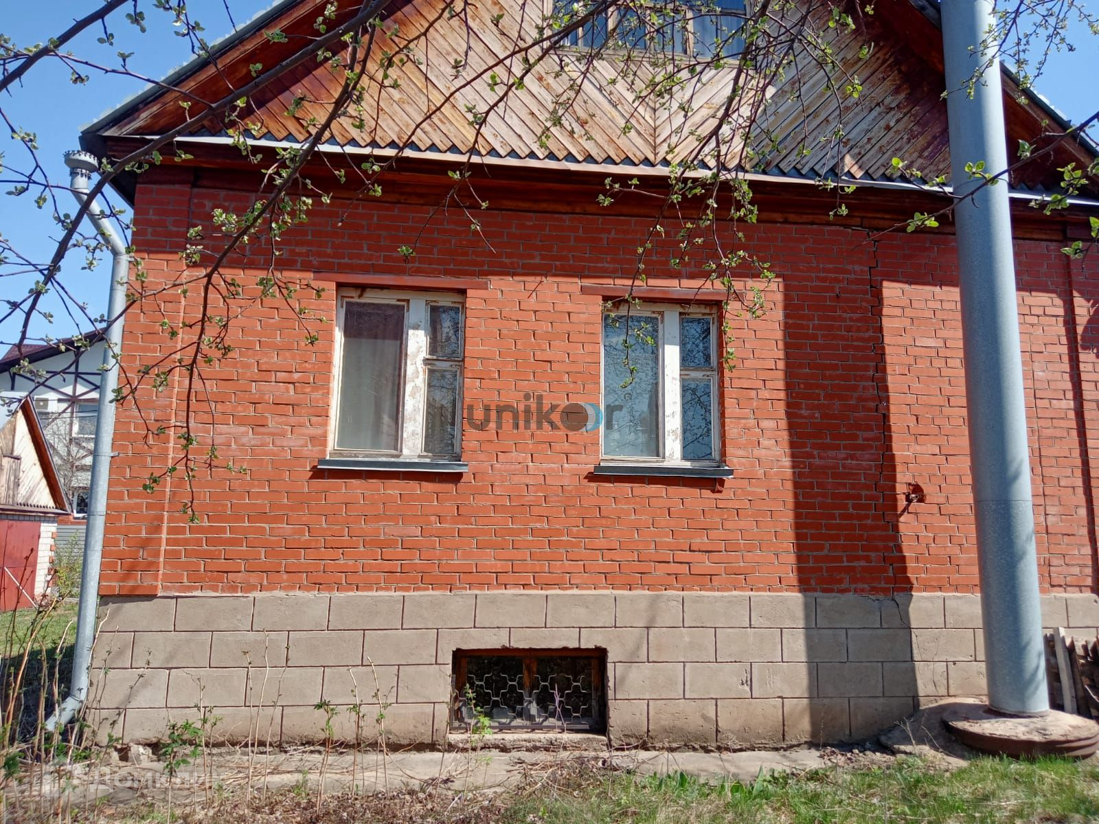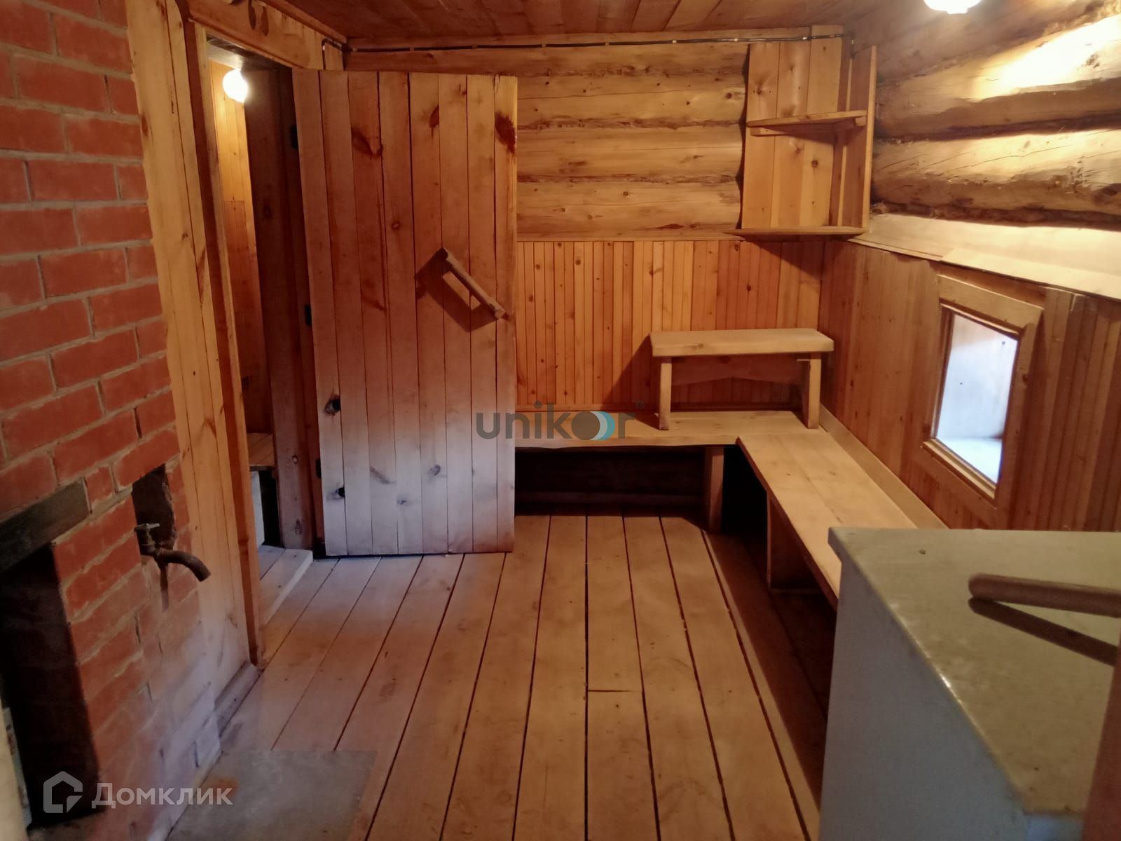 Стены дома из бревна, облицованы красным кирпичом, внутри обшиты вагонкой и покрыты лаком,