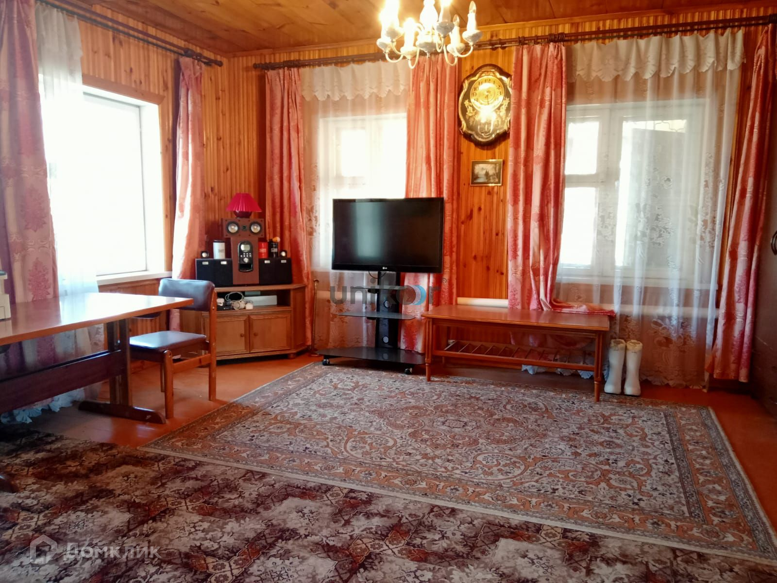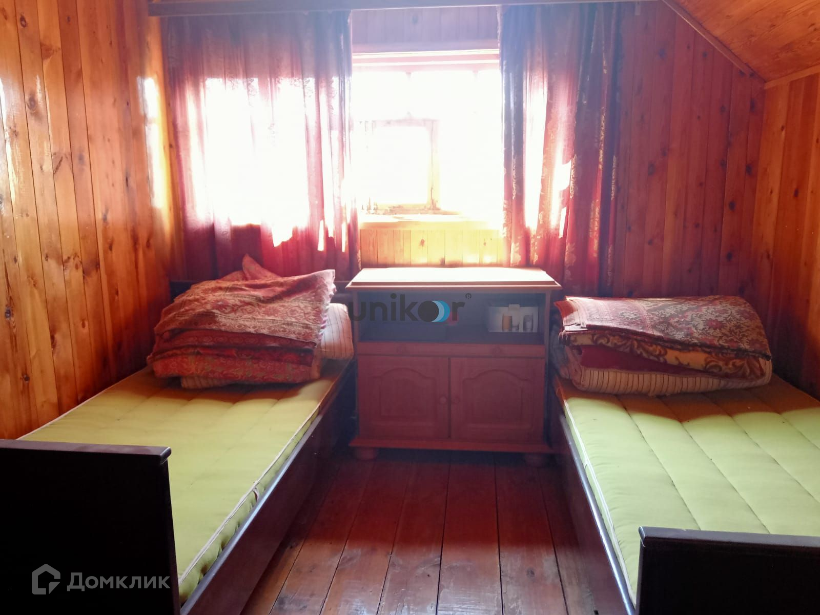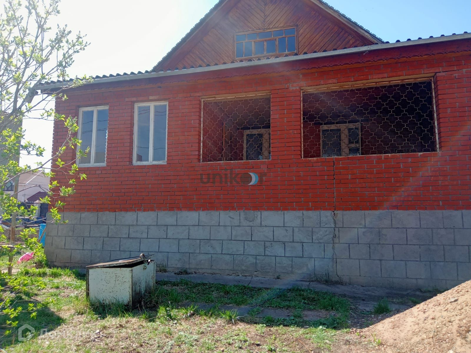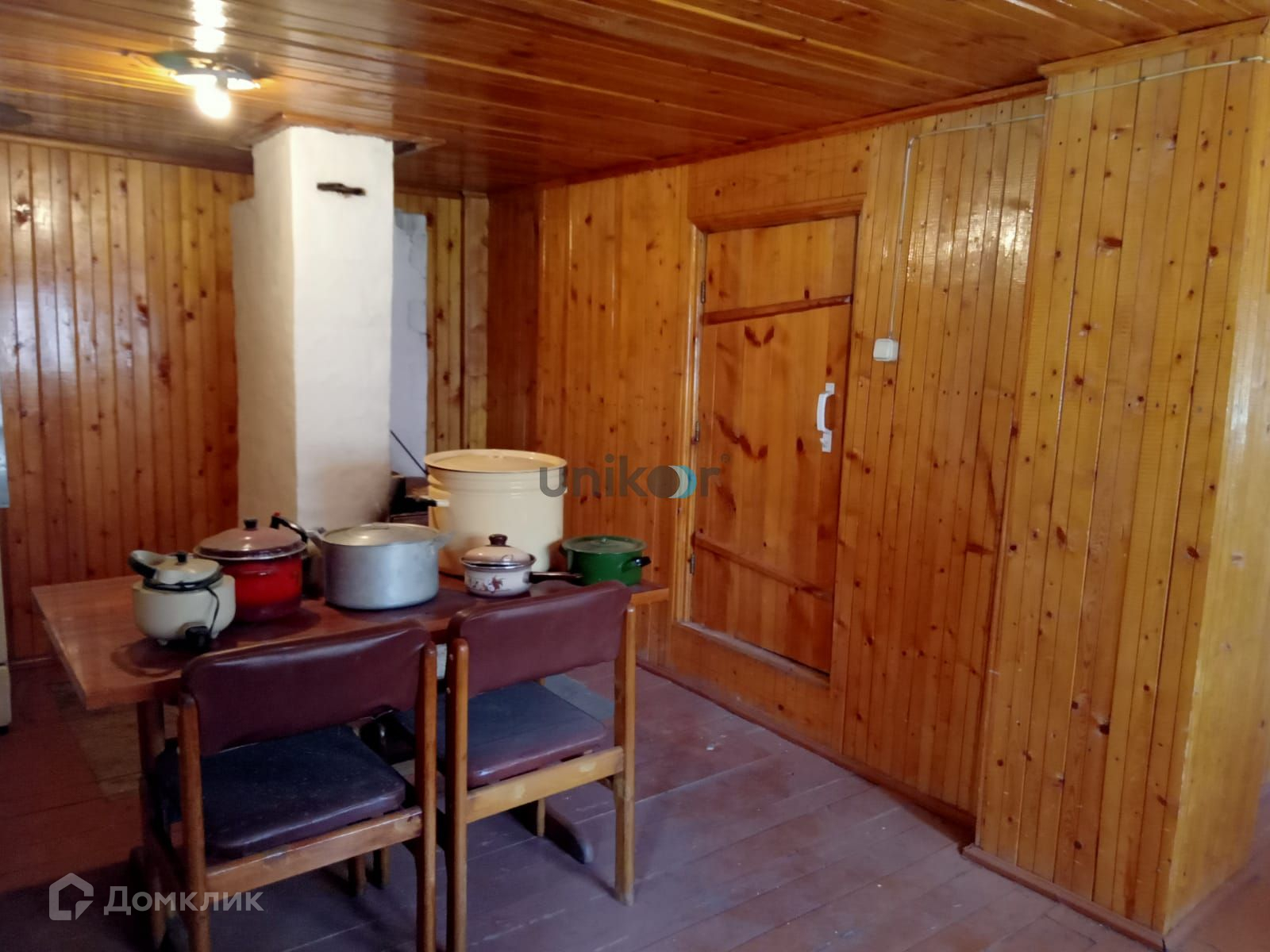 Стены дома из бревна, облицованы красным кирпичом, внутри обшиты вагонкой и покрыты лаком,