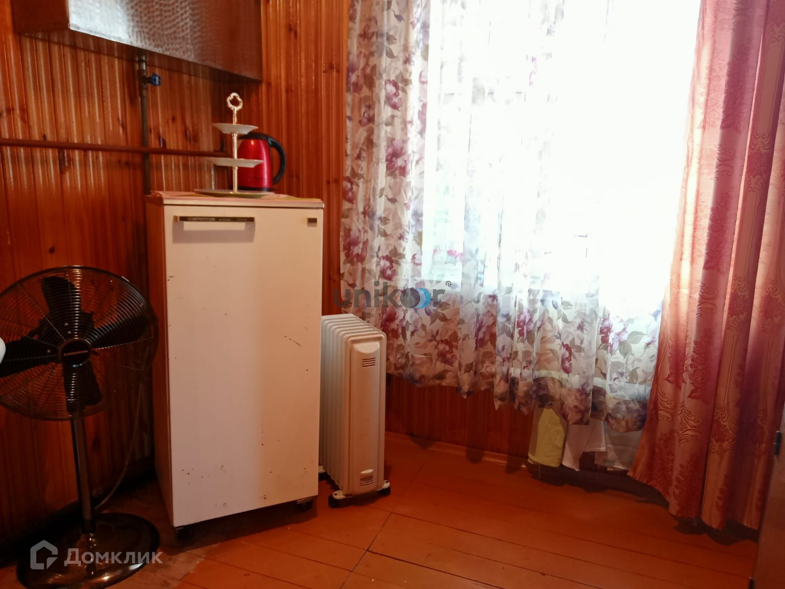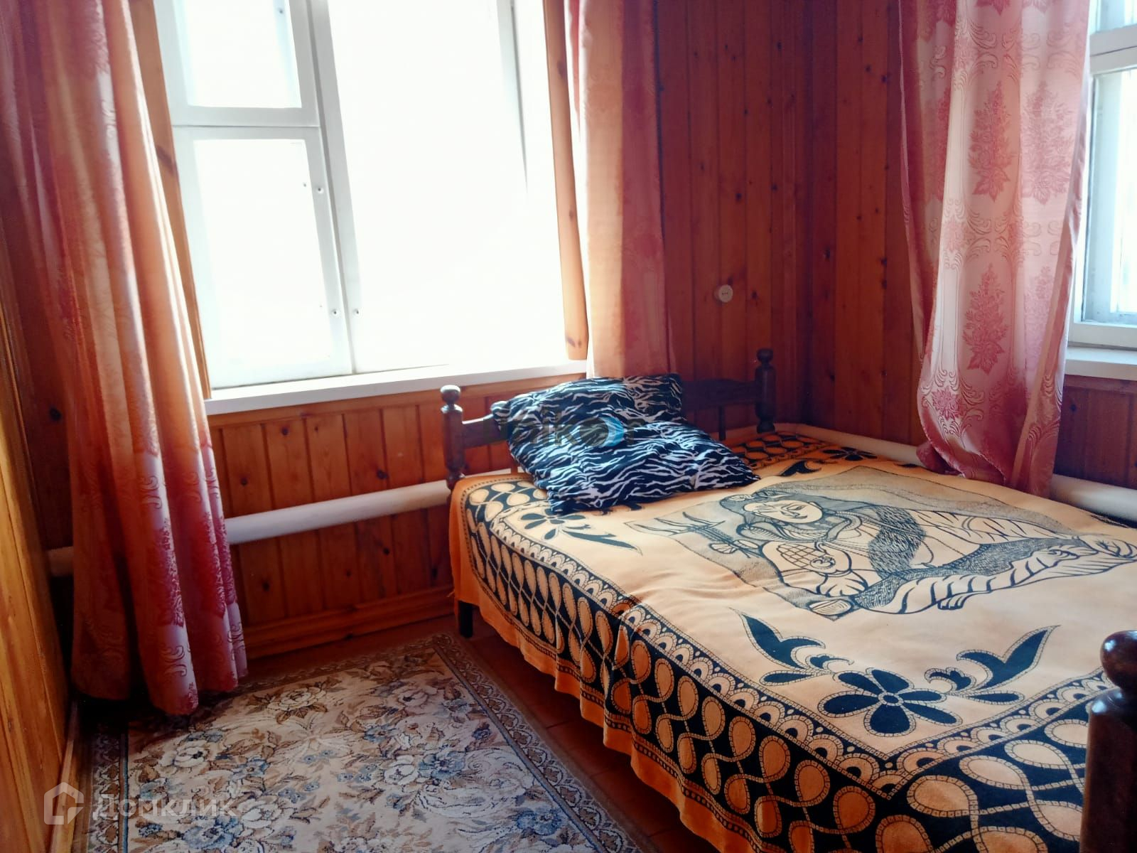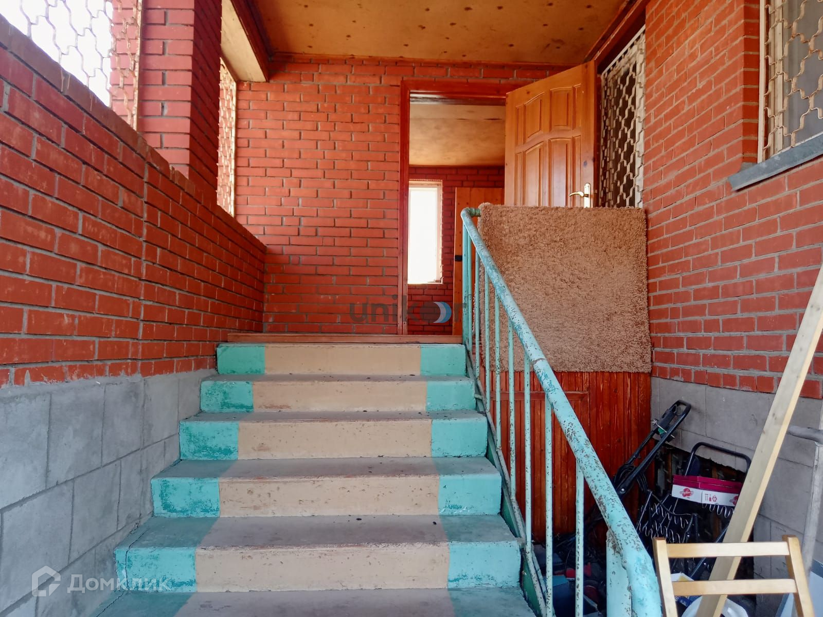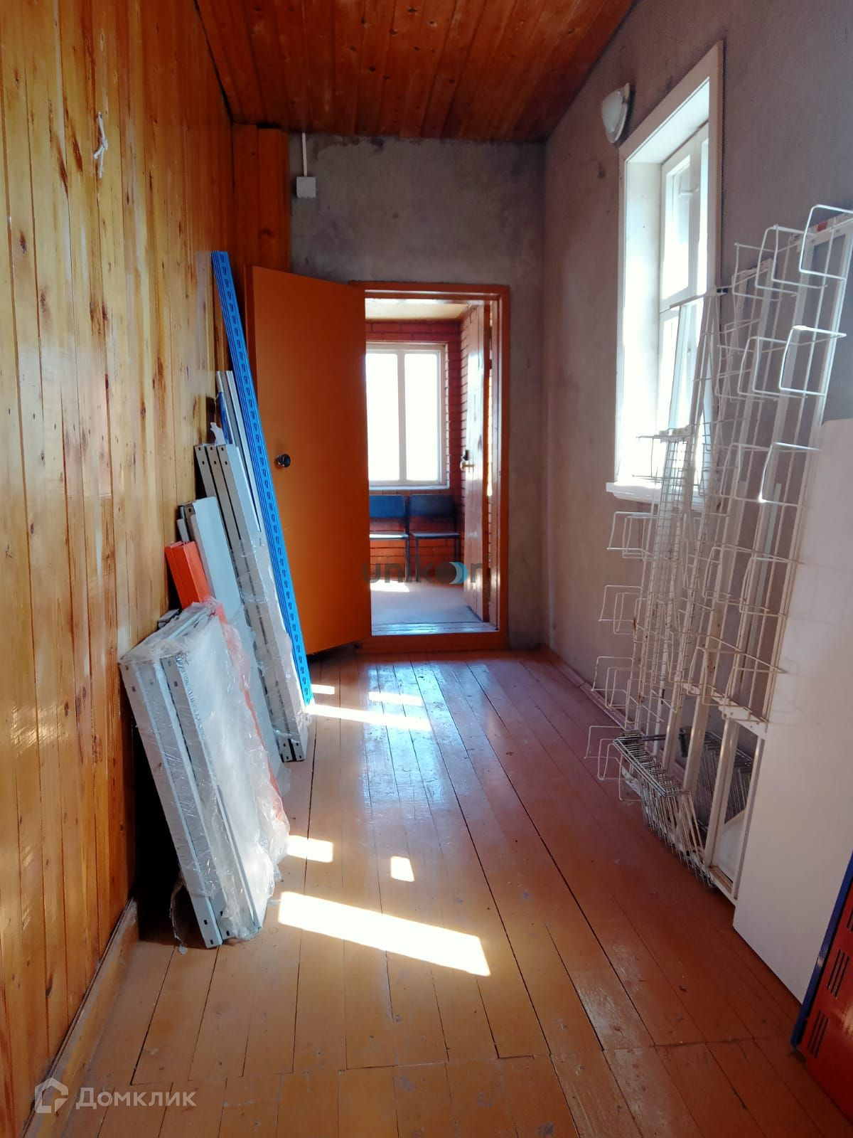 Стены дома из бревна, облицованы красным кирпичом, внутри обшиты вагонкой и покрыты лаком,