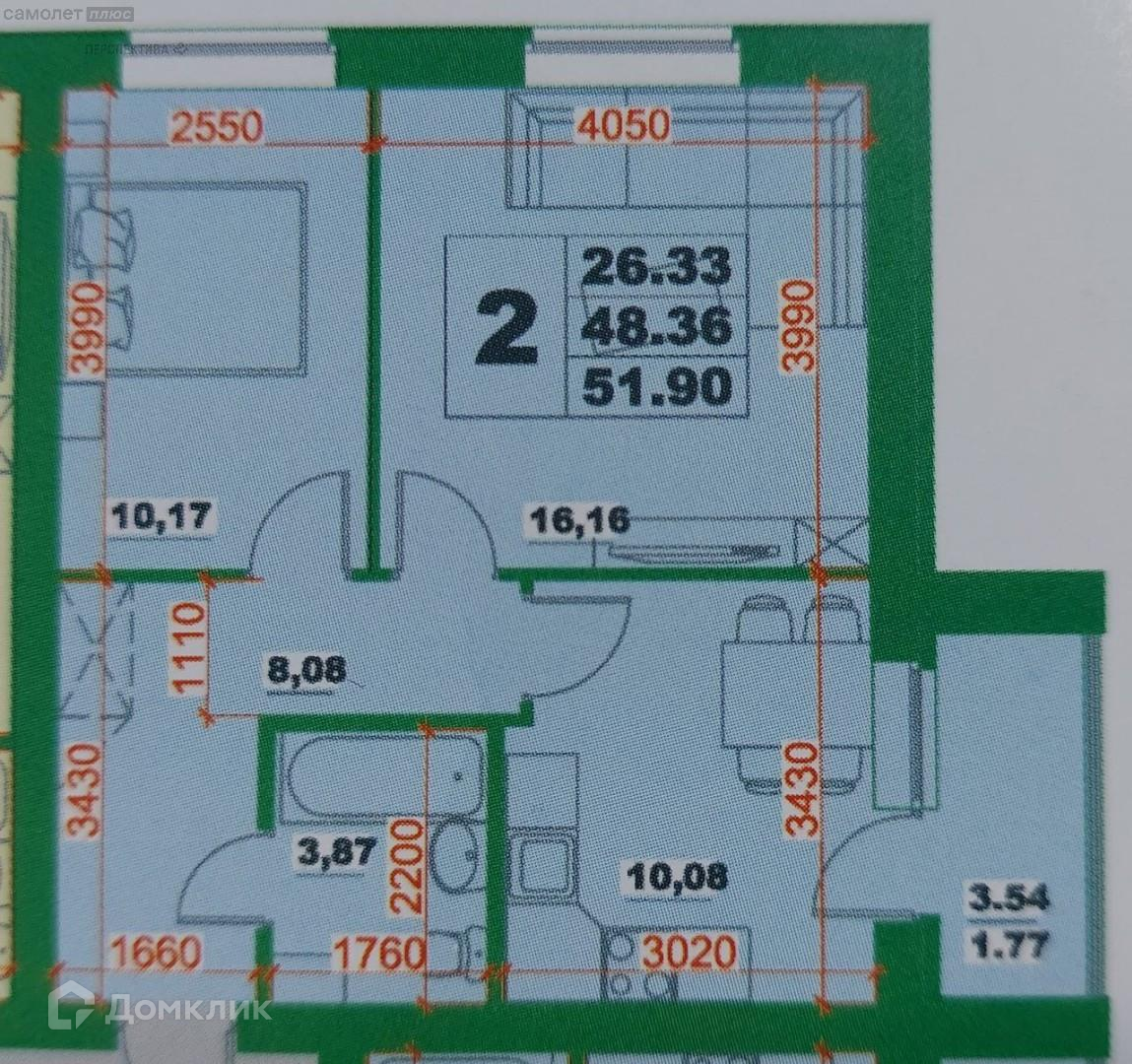 Общая площадь 45.4 м2
