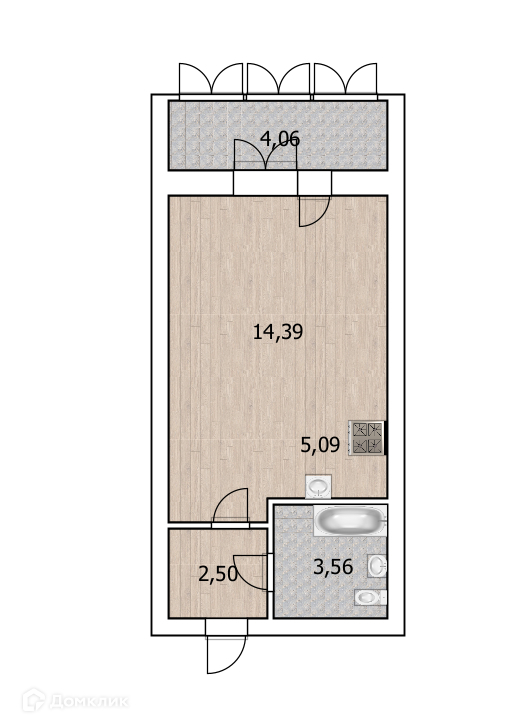 Квартира-студия, расположенная по адресу: ул. Игоря Талькова, д. 6, 1/7 этажность. Общая площадь 25,5 м2.