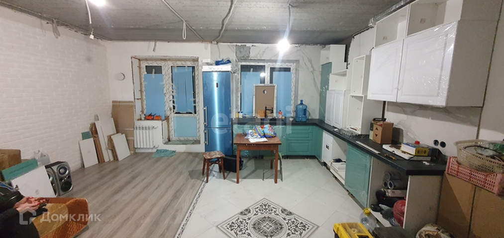 На первом этаже большая кухня-гостиная 28 кв.м с выходом на прилегающий огороженный земельный участок 0,7 сотки. Пол - кафель и ламинат. Имеется новый дорогой кухонный гарнитур (остается при продаже). На земельном участке можно разбить сад, сделать террасу, поставить баню-бочку.