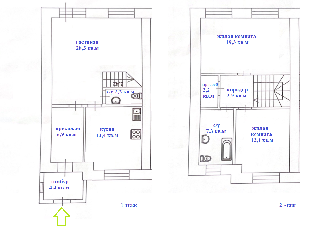 На 2 этаже: две жилые комнаты (19,3+13,1 кв.м), с/у, гардеробная, удобная лестница на 2 этаж.