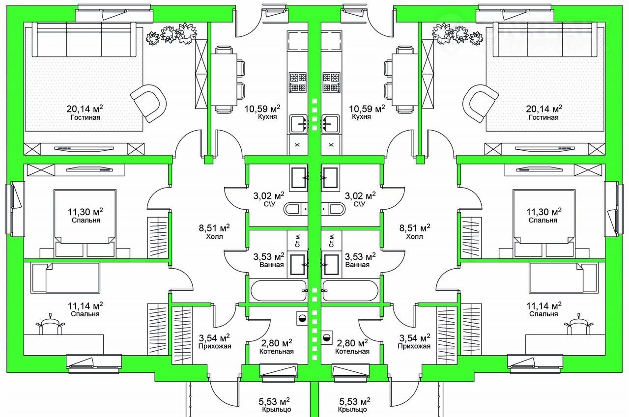 - уютная кухня, просторная гостиная (20 м²), 2 спальни с окнами, 2 санузла, прихожая с предусмотренным местом хранения, котельная, большой холл и прихожая.