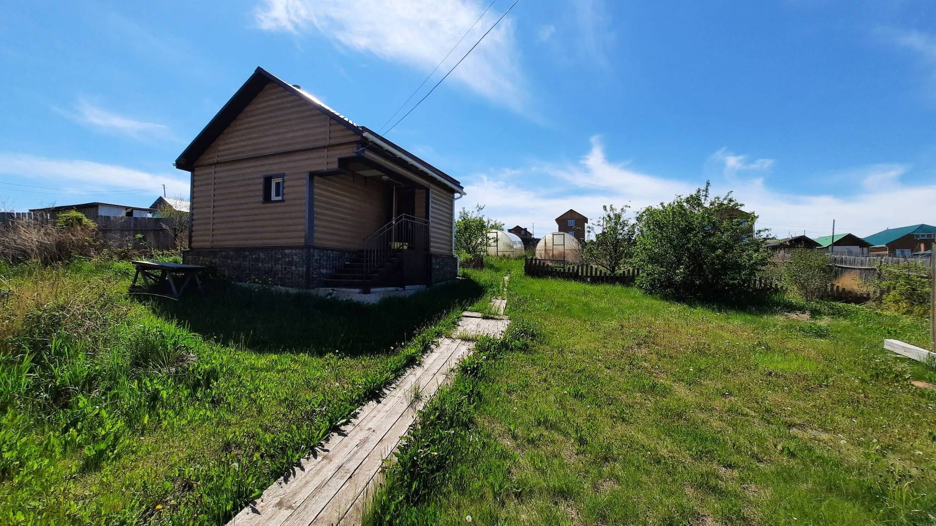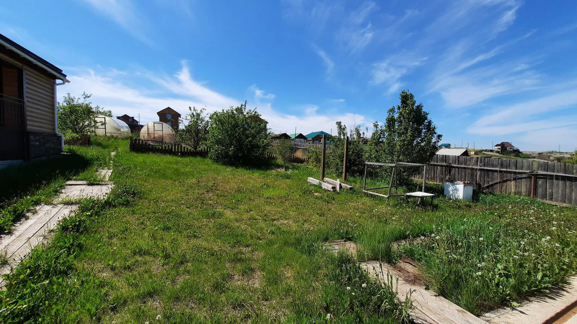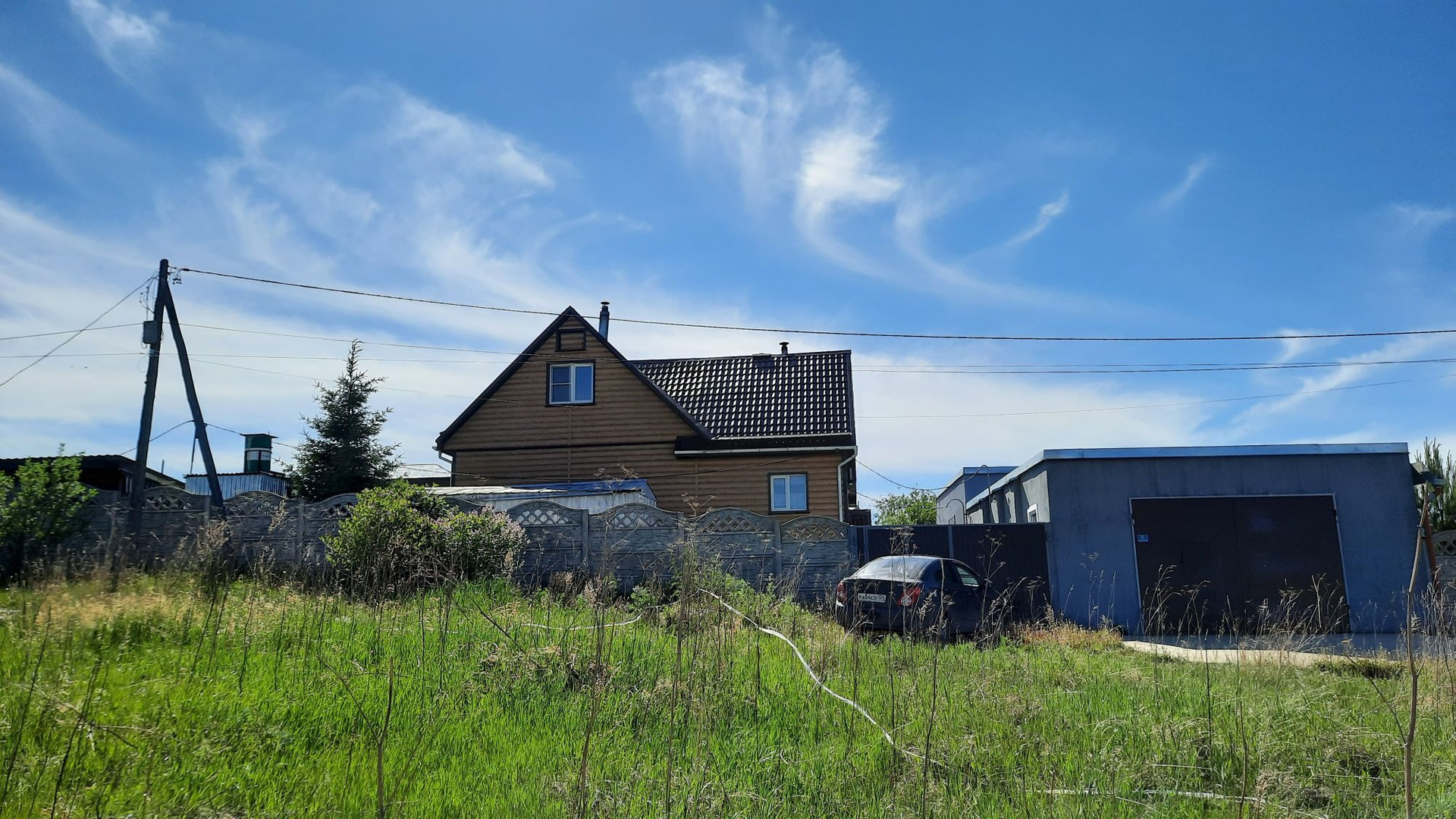 Дом расположен на возвышенности, откуда открывается потрясающий вид на поселок и луга.