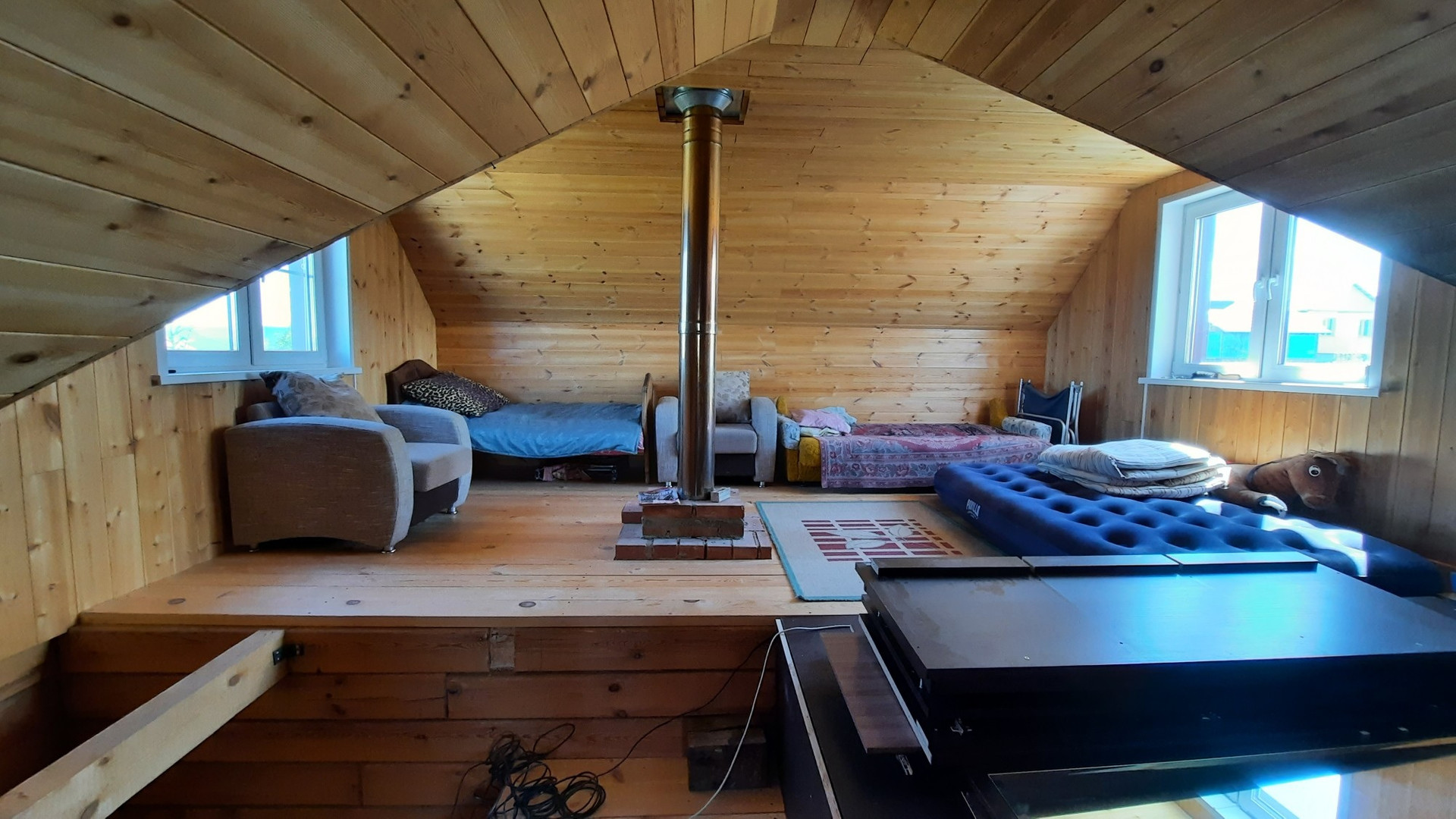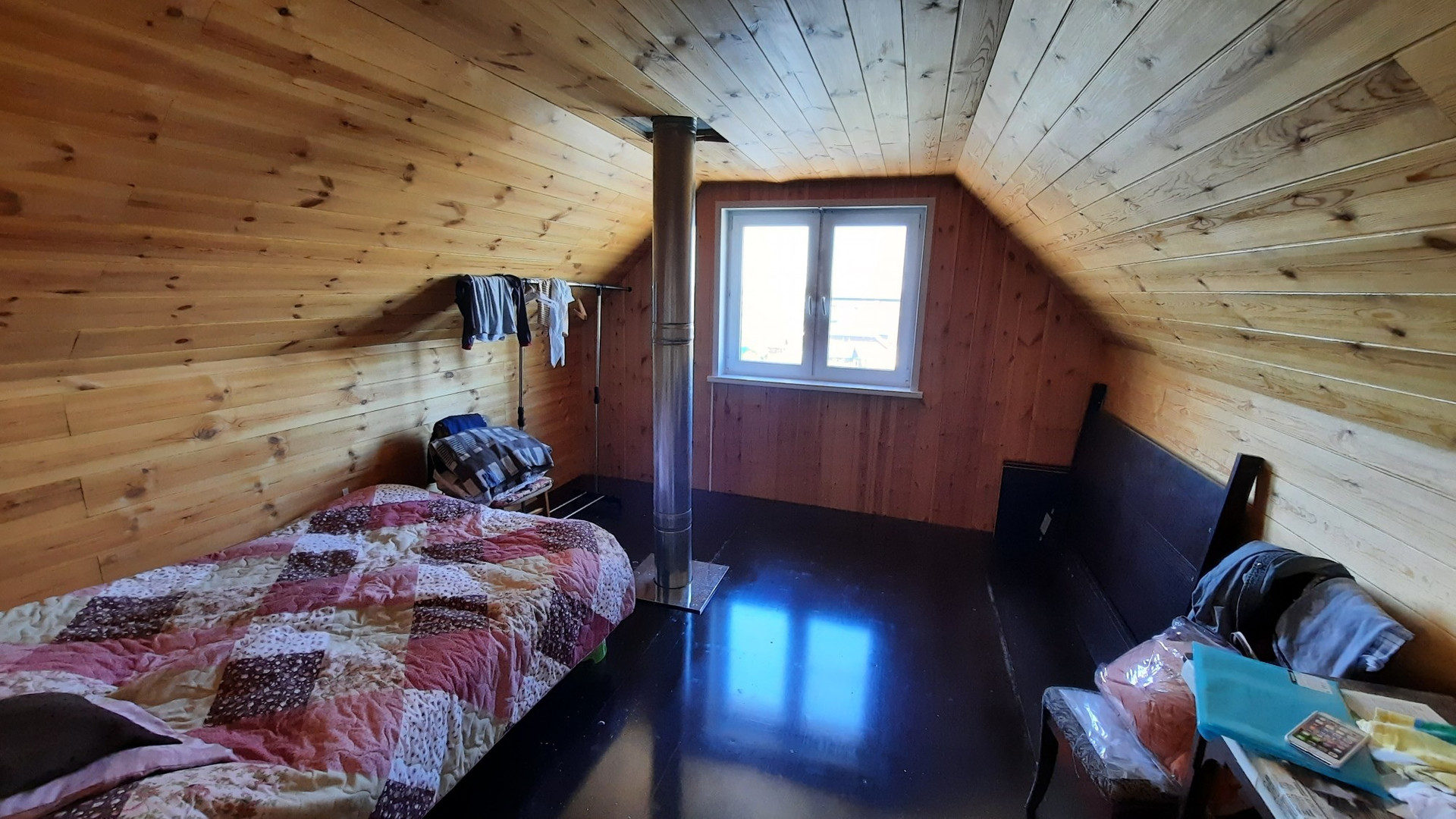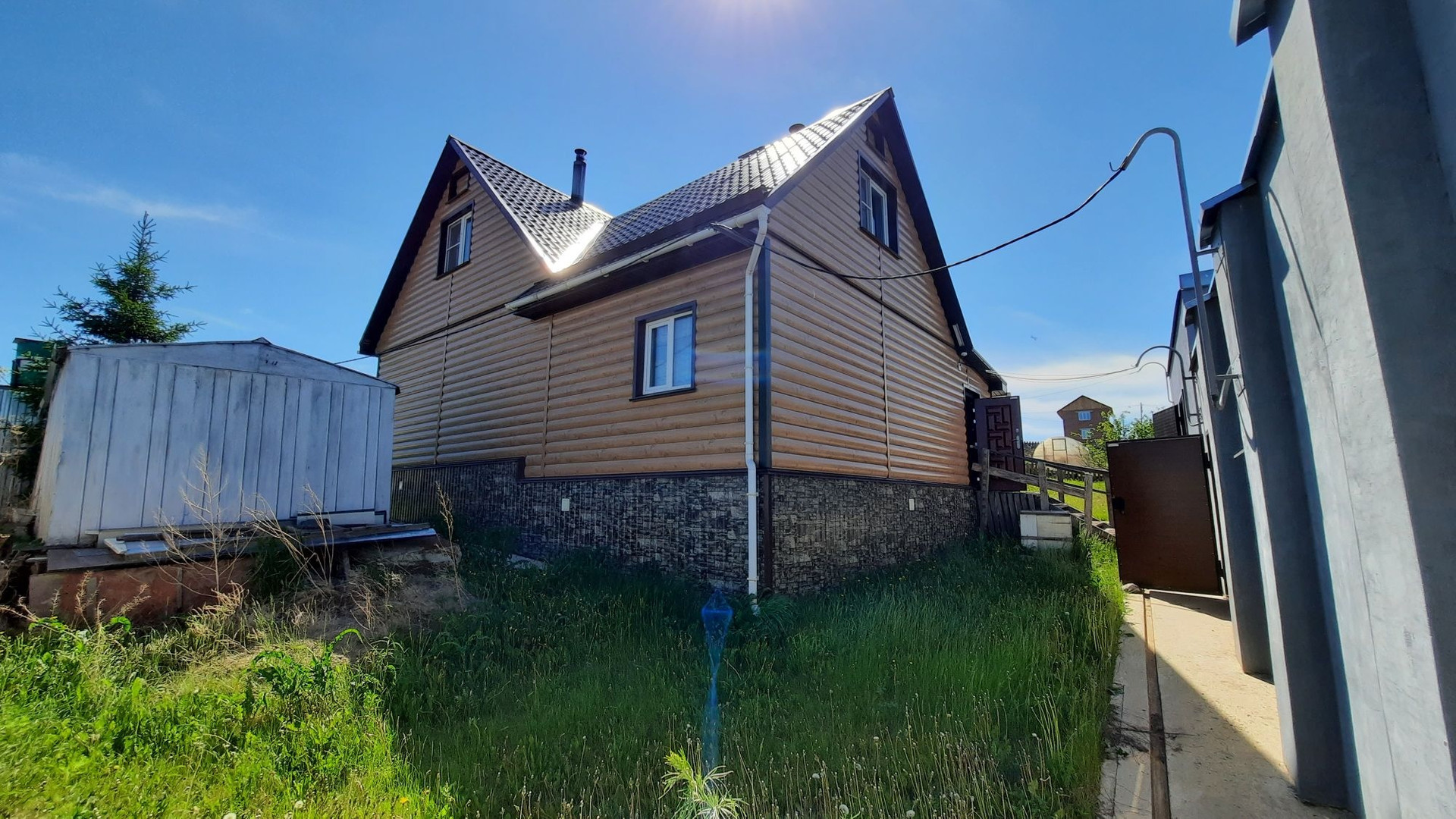 Дом расположен на возвышенности, откуда открывается потрясающий вид на поселок и луга.