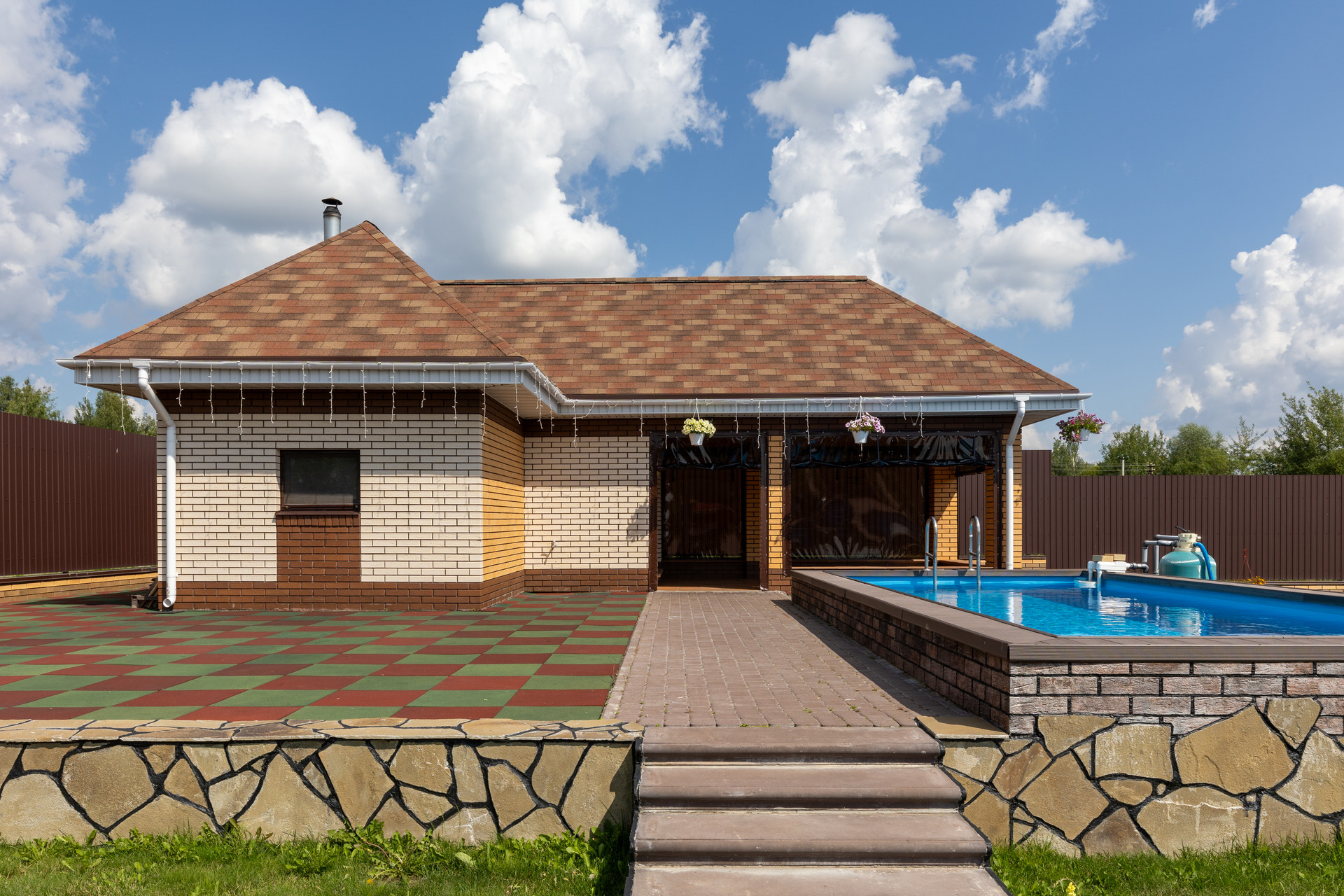 ⬇️Баня 2017 года постройки, полностью построена из кирпича снаружи и отделка из липы внутри, по периметру бани установлены ливневки. В бане установлена система теплый полов, что позволяет всегда поддерживать в бане комфортную температуру. Также предусмотрена летняя веранда с мягкими окнами и видом на бассейн.