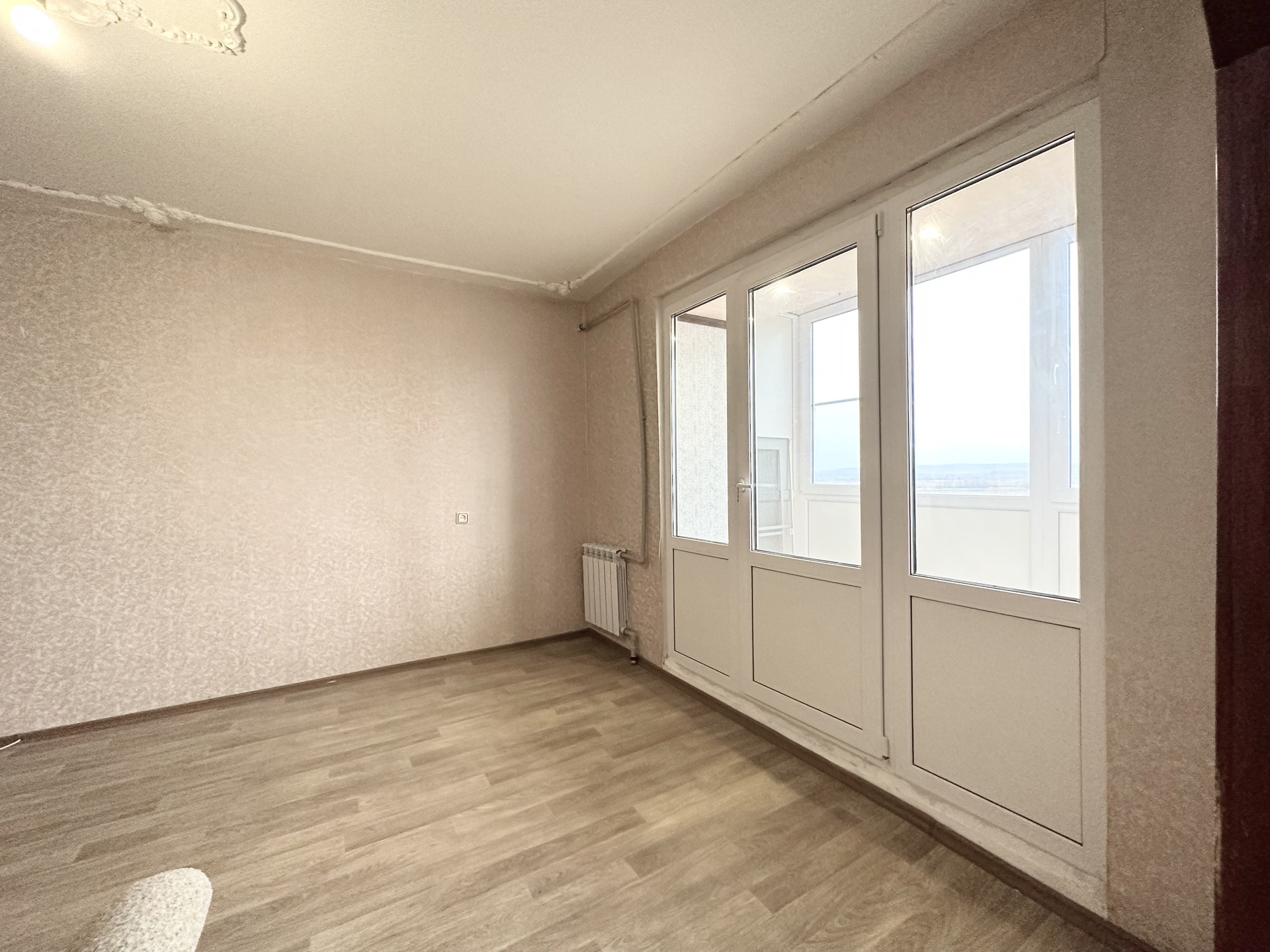 Современная функциональная планировка: большая кухня, практичная комната, есть помещение под гардеробную, удобный санузел, просторный застеклённый балкон.