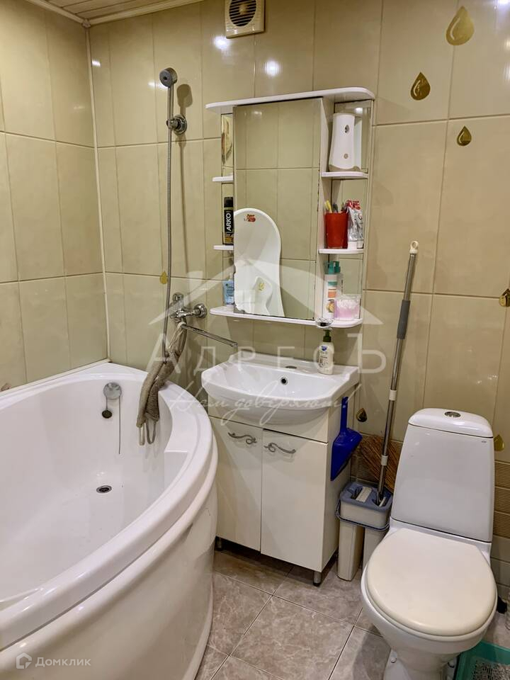 состоянии, подвесной потолок с точечными светильниками, на полу ламинат, в ванной