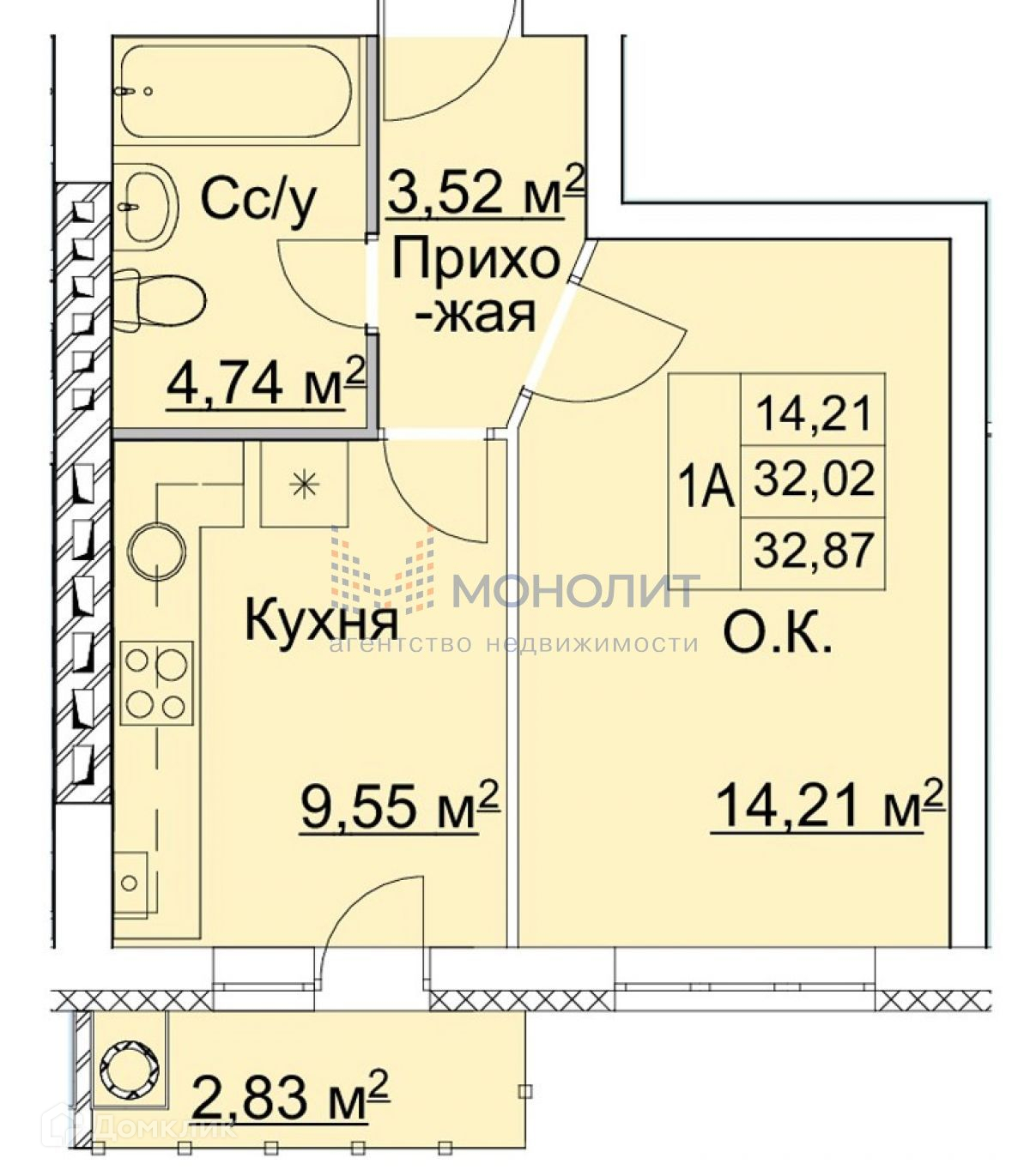 Общая площадь 32.8 м2