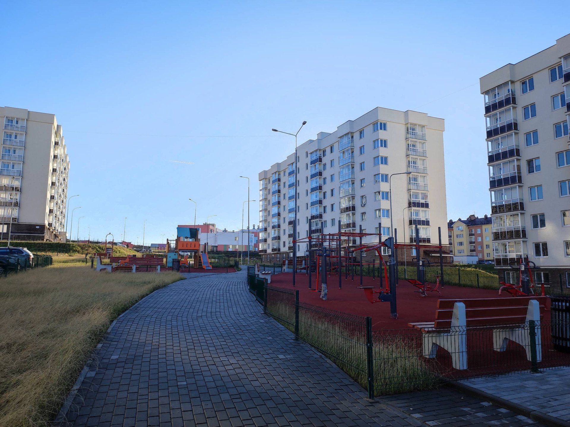 ЖК отличается отличной продуманной придомовой территорией — установлено множество детских площадок с различным игровым и спорт оборудованием оборудованием, в т.ч. для большого и малого тенниса, смонтирована огороженная спортивная площадка с баскетбольными кольцами. Дворы свободные от машин.