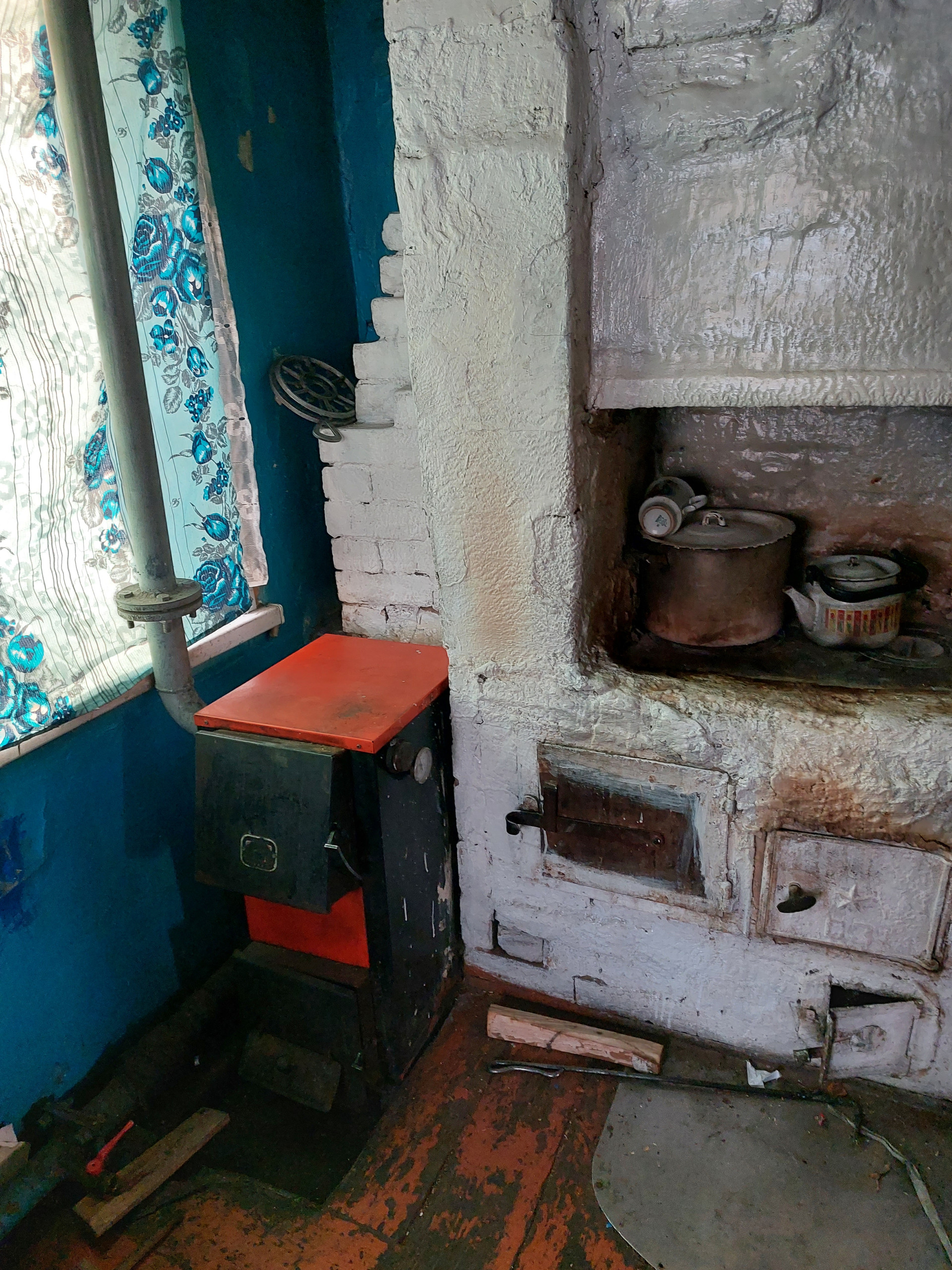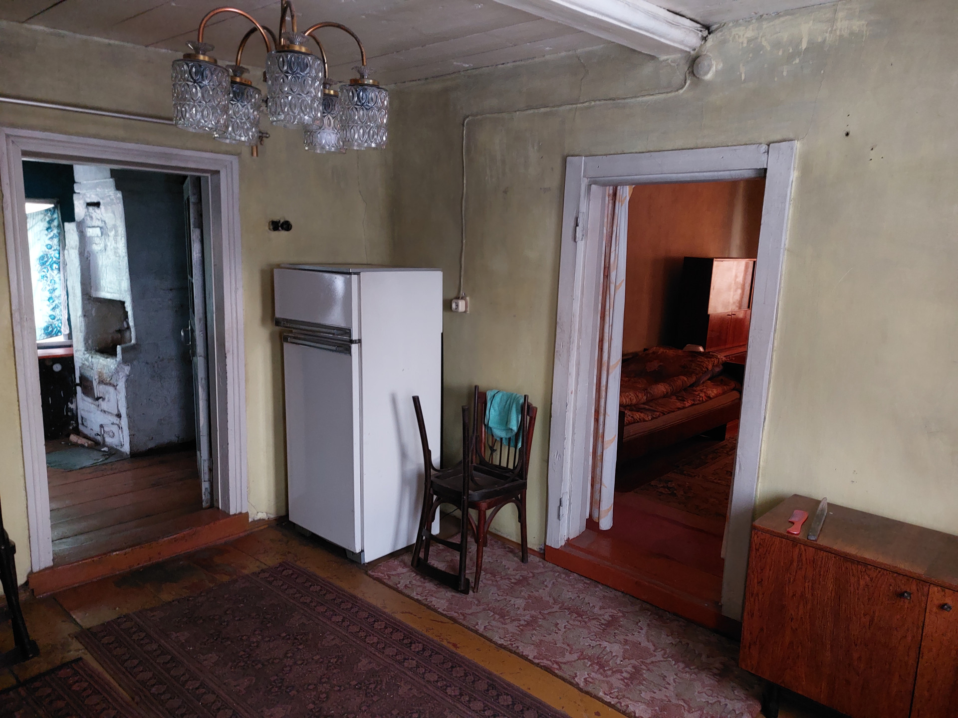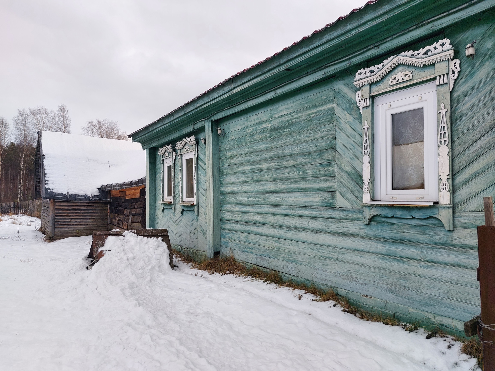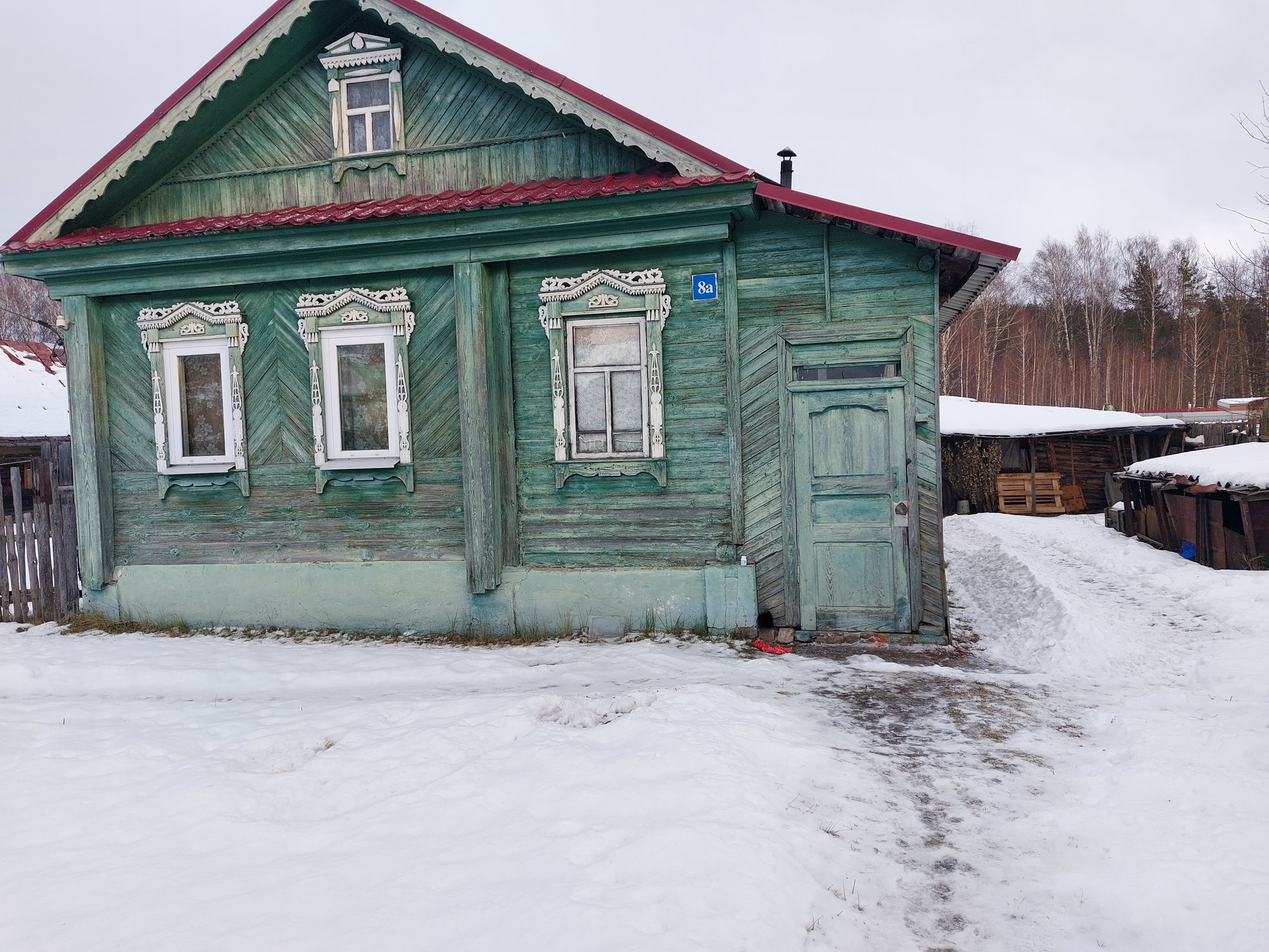 Дом бревенчатый с кирпичным пристроем для круглогодичного проживания, крыша покрыта профнастилом, есть электричество и скважина в доме, туалет на улице, газ проходит вдоль забора, паровое отопление от твердотопливного котла (есть большой запас дров и брикетов), окна пластиковые. Во дворе есть кирпичный сарай с погребом, дровник, пристроена бревенчатая хозяйственная постройка для содержания домашних животных.