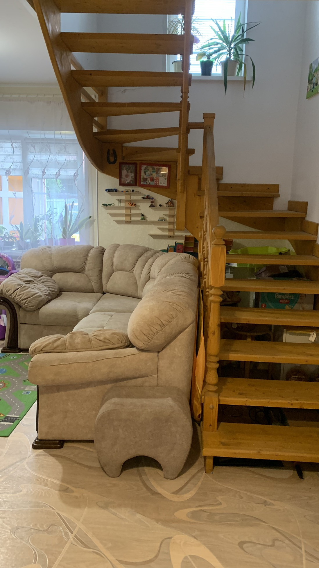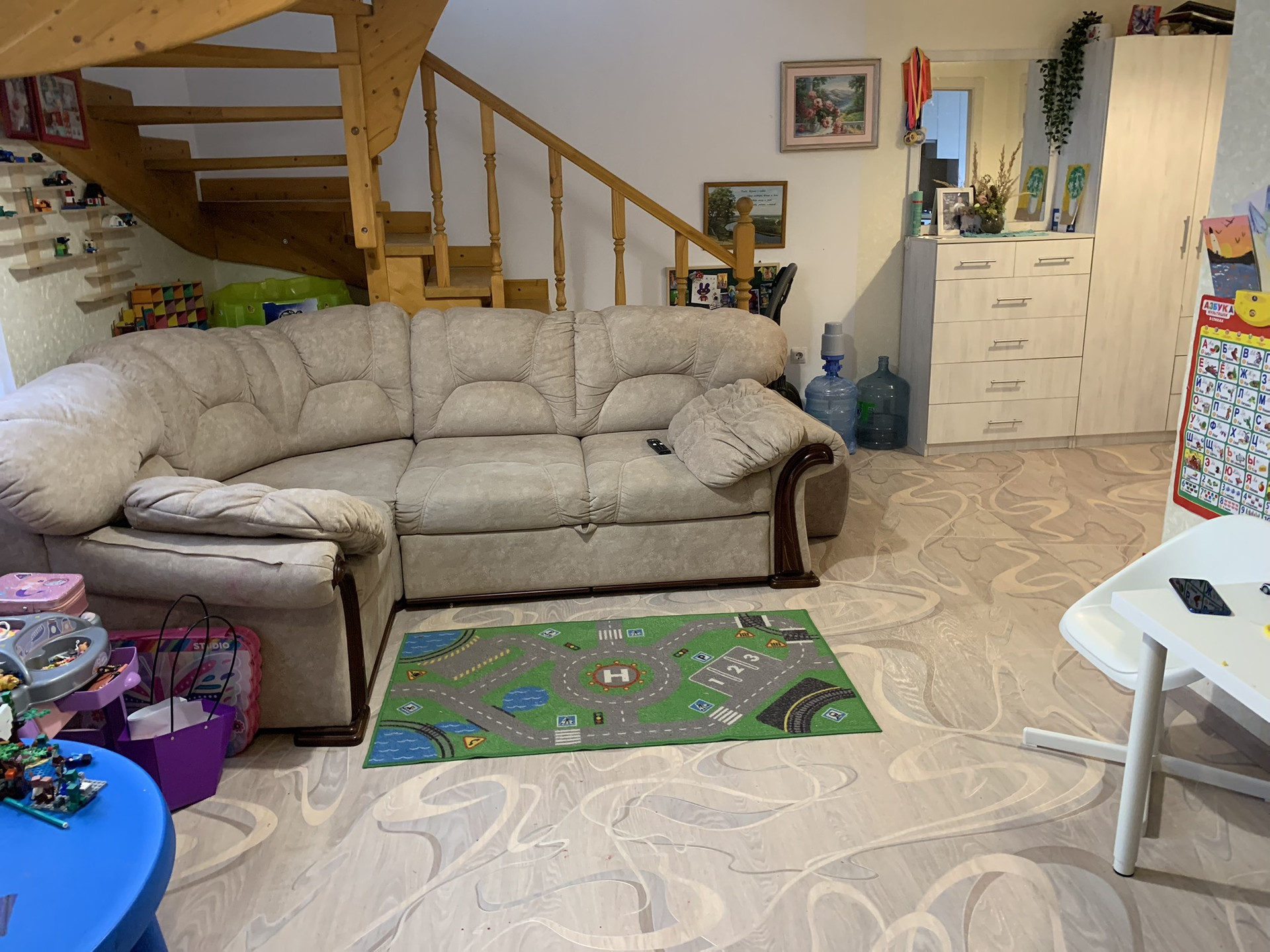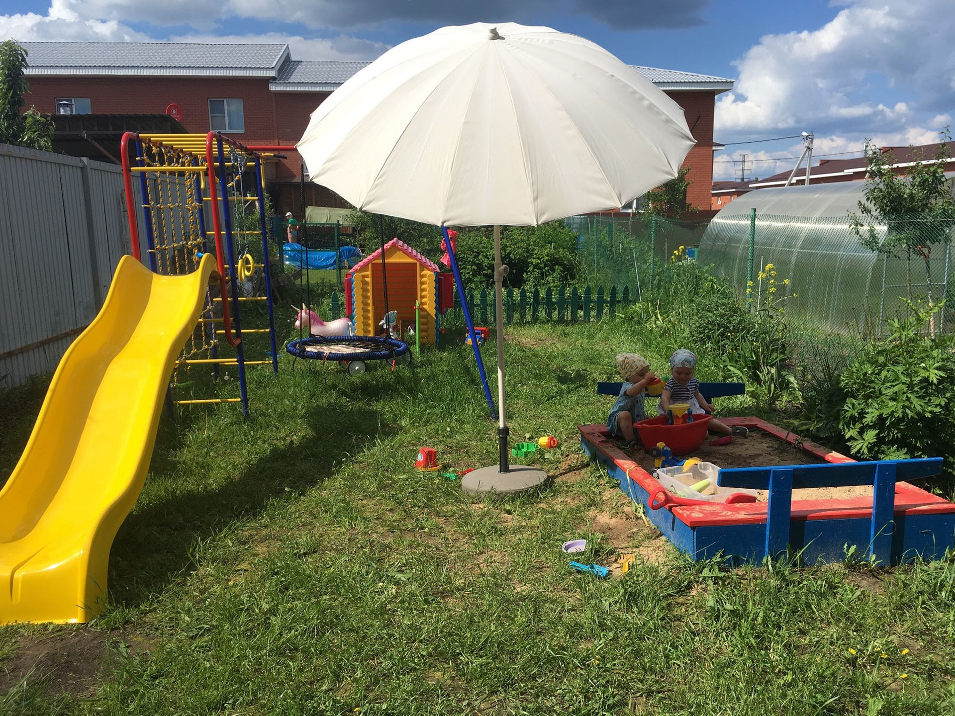 На первом этаже находится кухня и гостиная с выходом на участок. На участке расположен детский игровой комплекс.