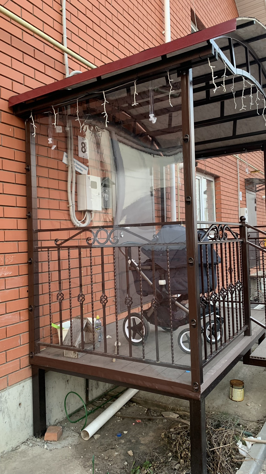 Перед домом облагороженная территория. Асфальтированная парковка на две машины и сделано новое крыльцо (сбоку закрыто мягкими окнами).
