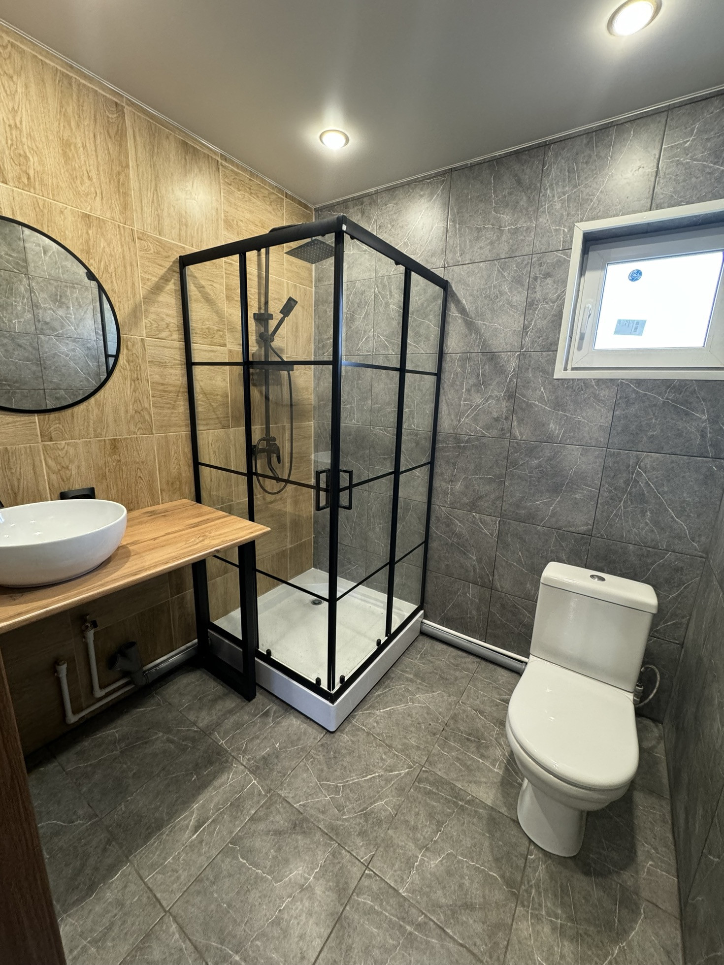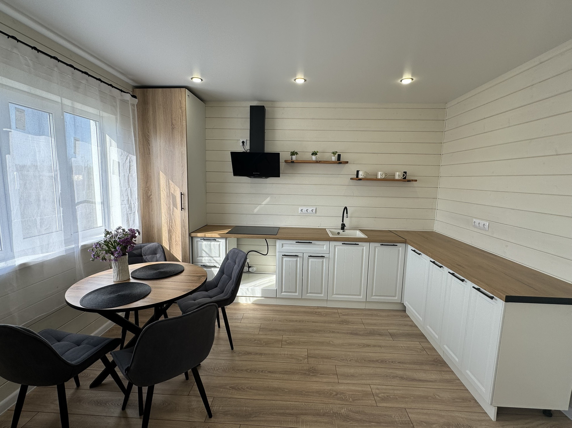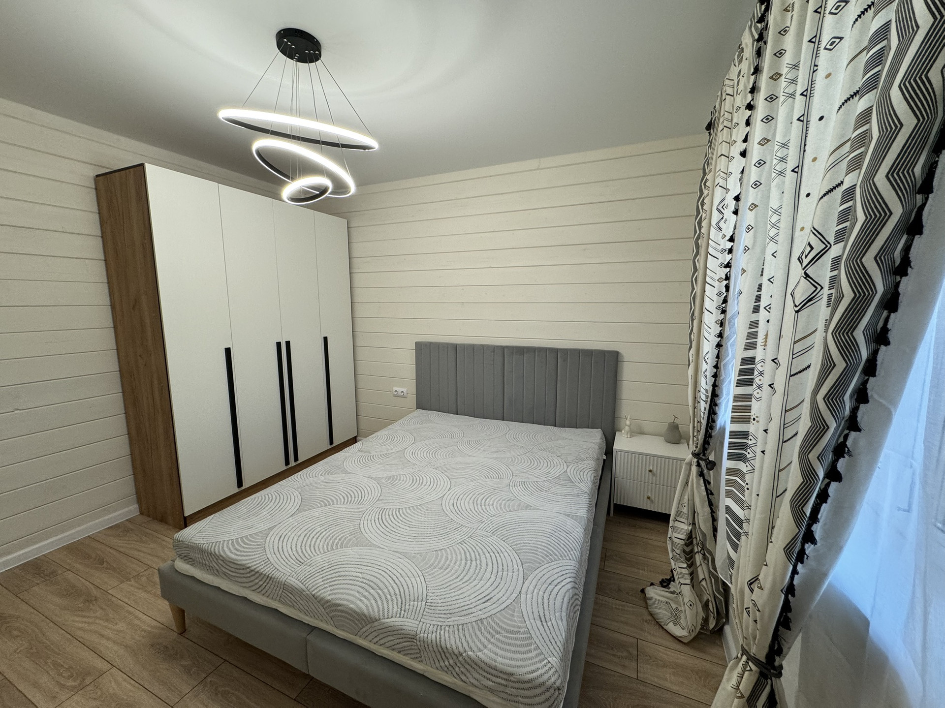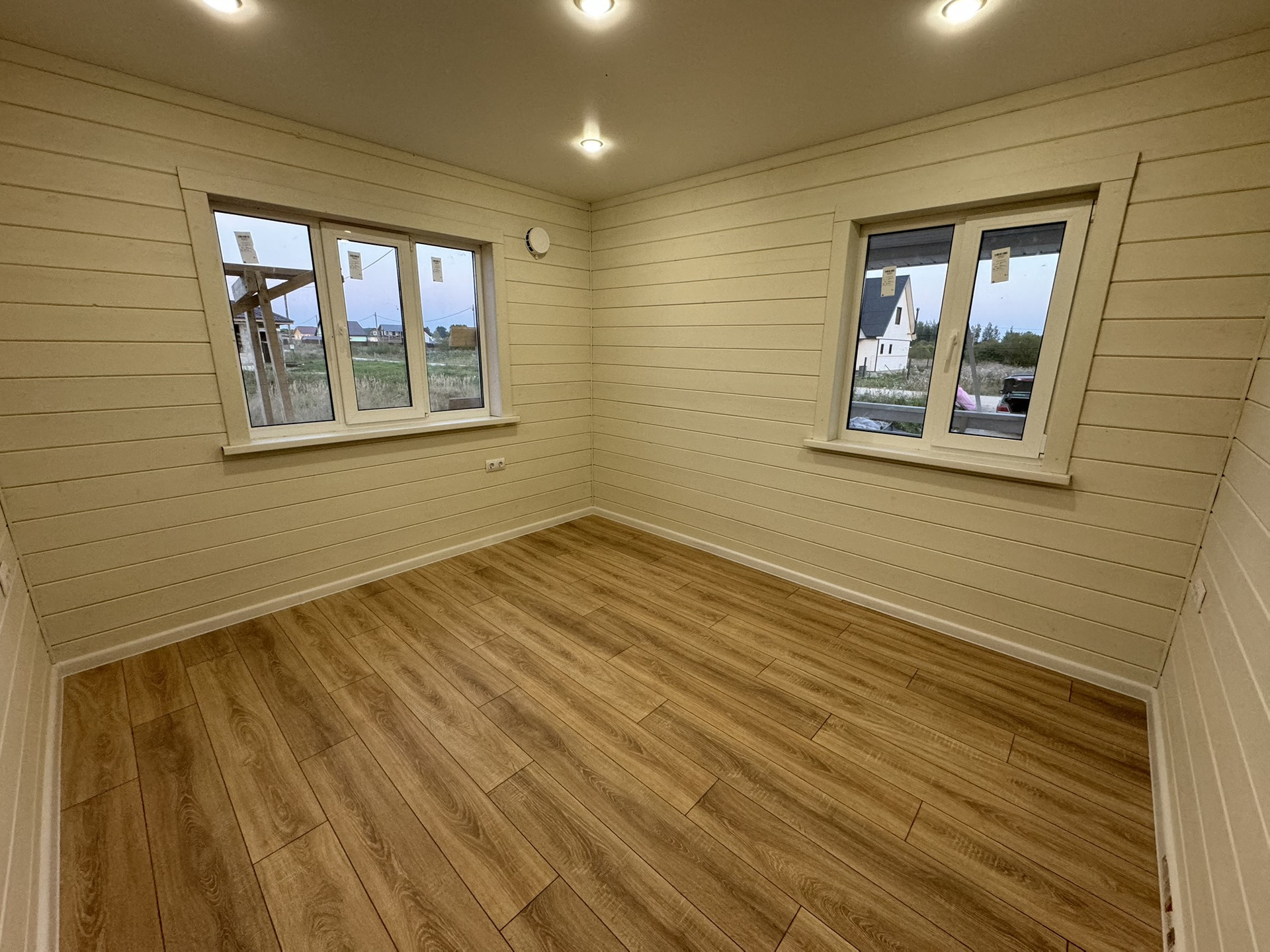 Отделка стен окрашенная имитация бруса, в с/у керамогранит + натяжные потолки, полы -ламинат.