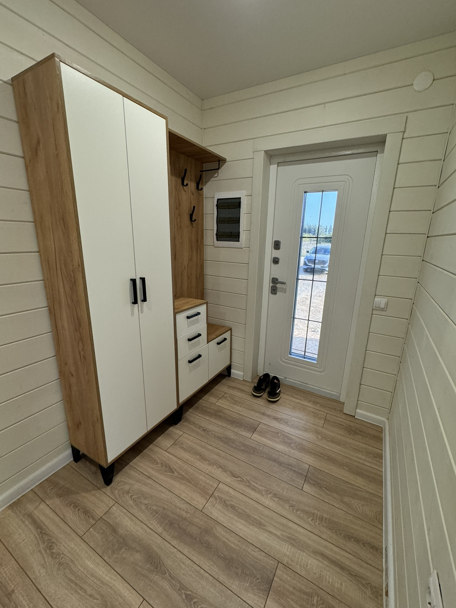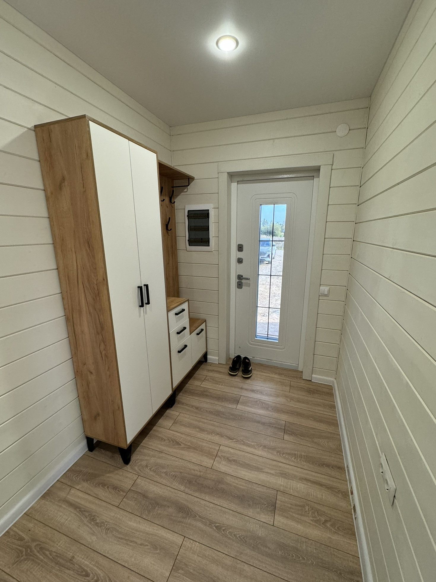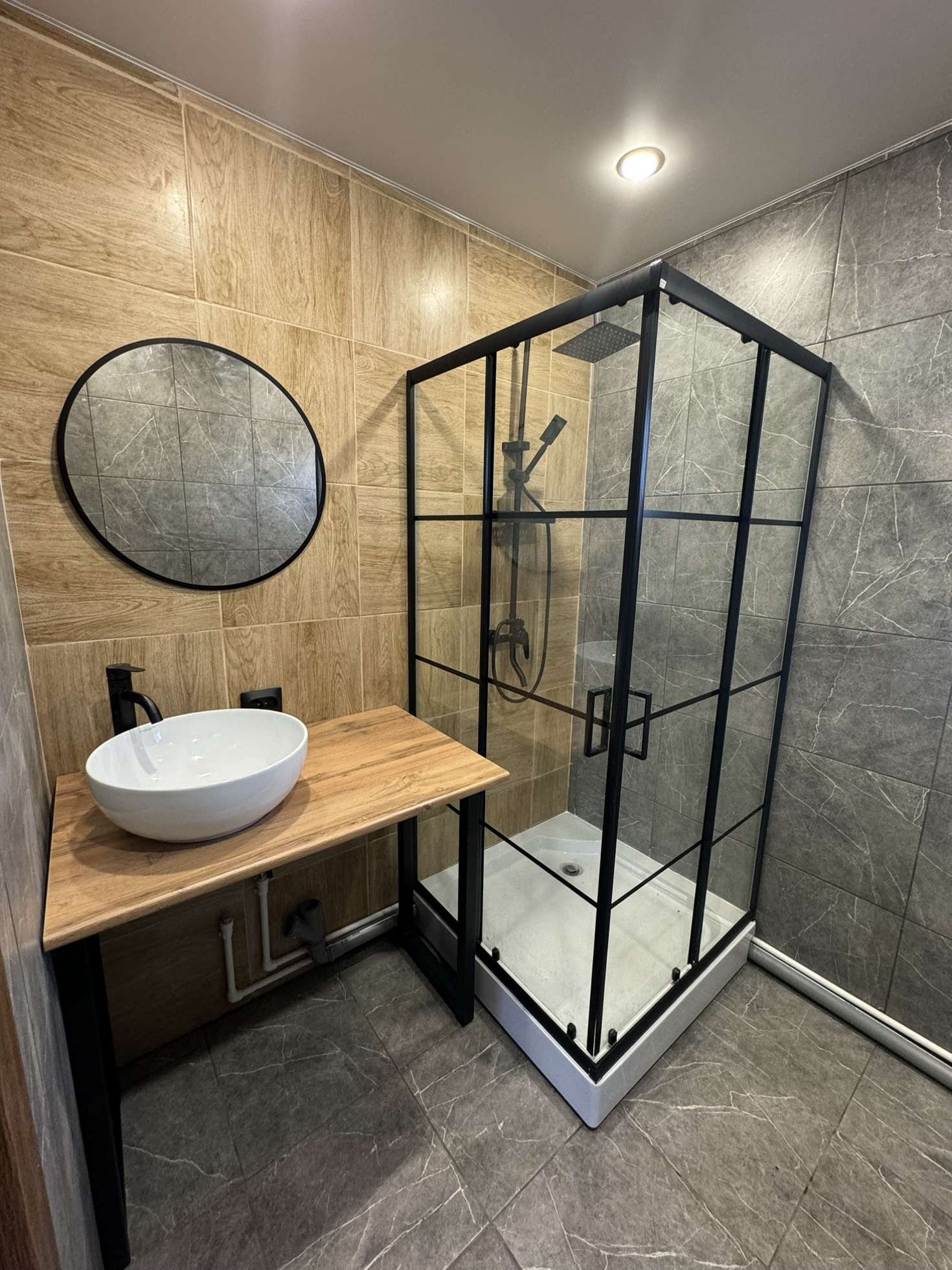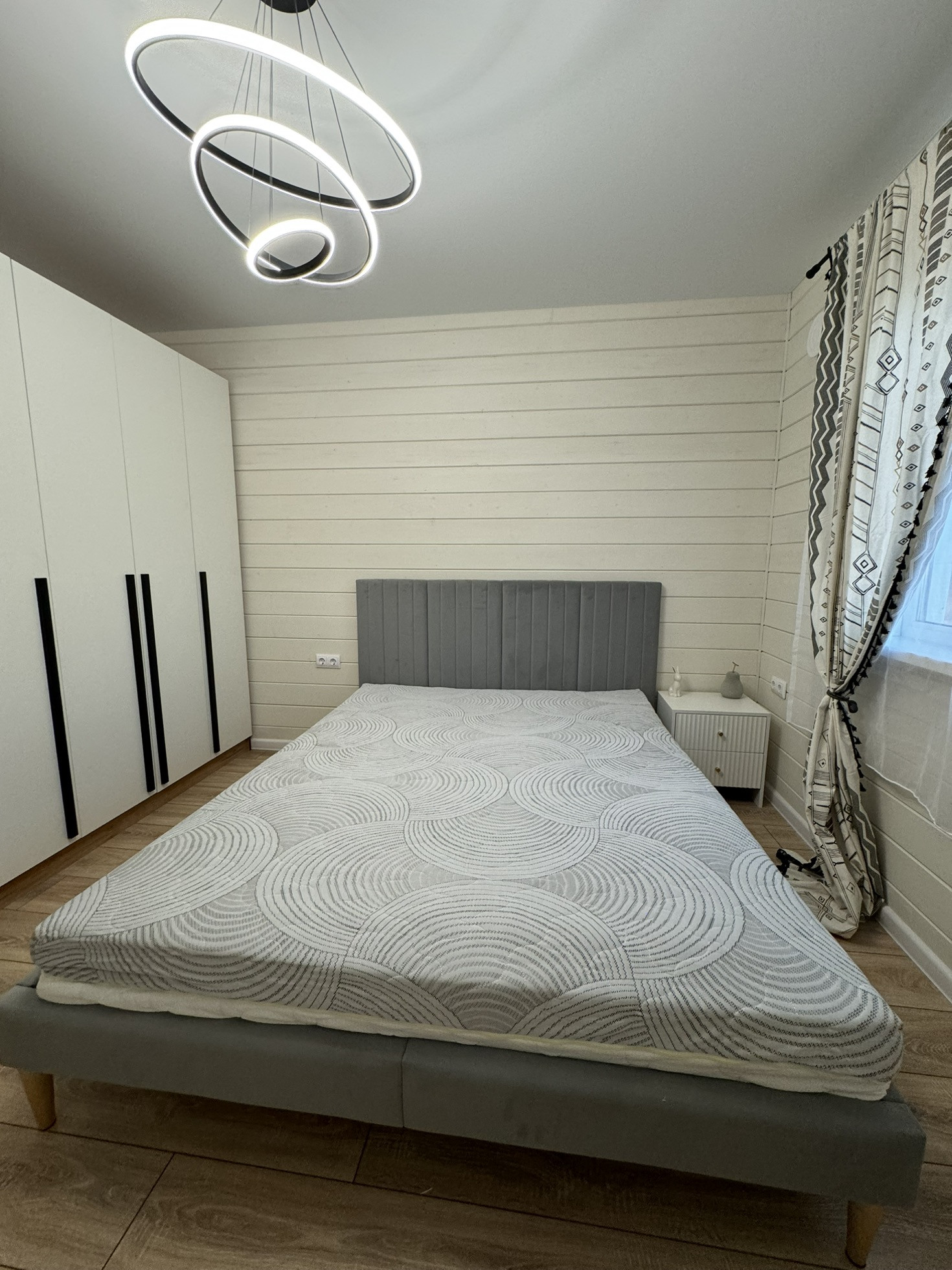 Отделка стен окрашенная имитация бруса, в с/у керамогранит + натяжные потолки, полы -ламинат.