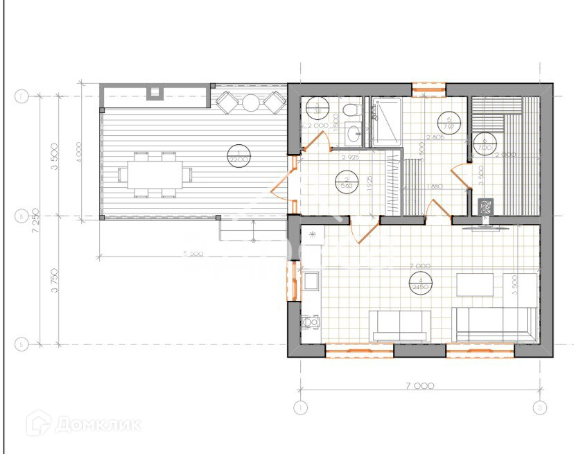 Дом с баней внутри, есть место под сауну и душевую, просторная гостиная с камином. На 2 этаже планировалось 3 спальни и сан узел.