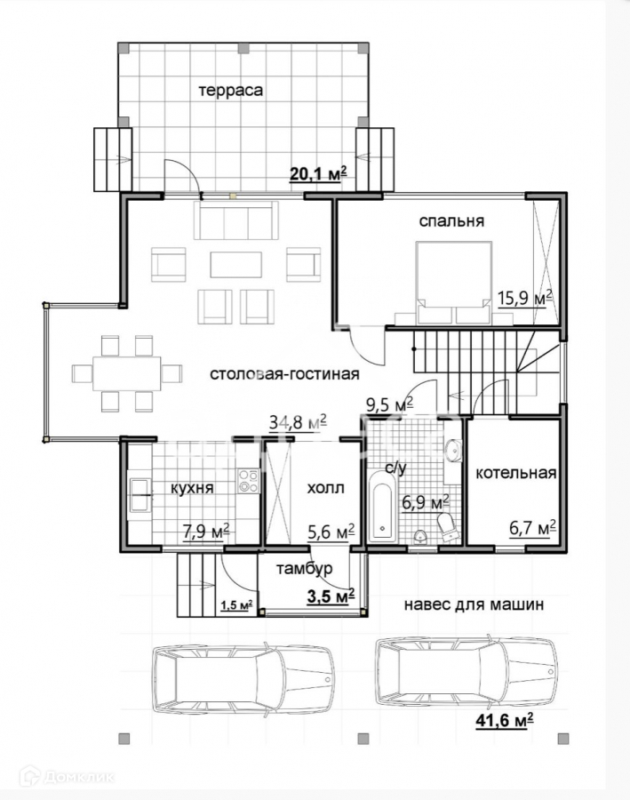 К дому пристроен навес под две машины с отдельным входом а также просторная терраса. В доме много окон, что обеспечивает хорошее дневное освещение, дает возможность наслаждаться живописными видами нетронутой природы находясь в домашнем уюте  и минимизирует ваши расходы на оплату электроэнерегии.