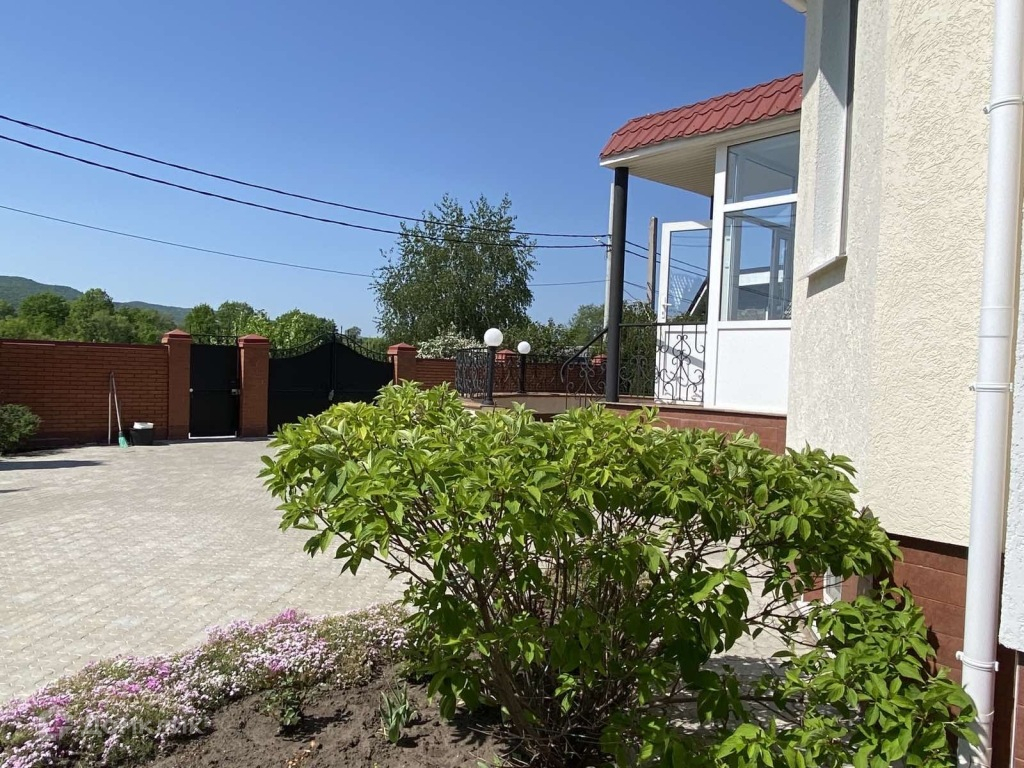 Дом утопает в зелений. Участок ровный, квадратный. Ландшафтный дизайн. Разнообразные декоративные кустарники
