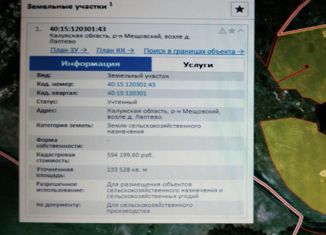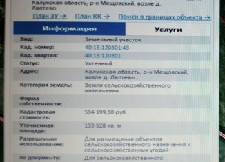 Киевское шоссе 220 км от МКАД , 40 га в окружении поймы реки , участок находиться районе деревни Лаптево , на участке была скважина и водонапорная башня надо прочистить , 30 га разрешенное использование: для размещений объектов с/х назначения , для с/х производства , 10 га ЛПХ . электричество на участке, газ вдоль деревни . |