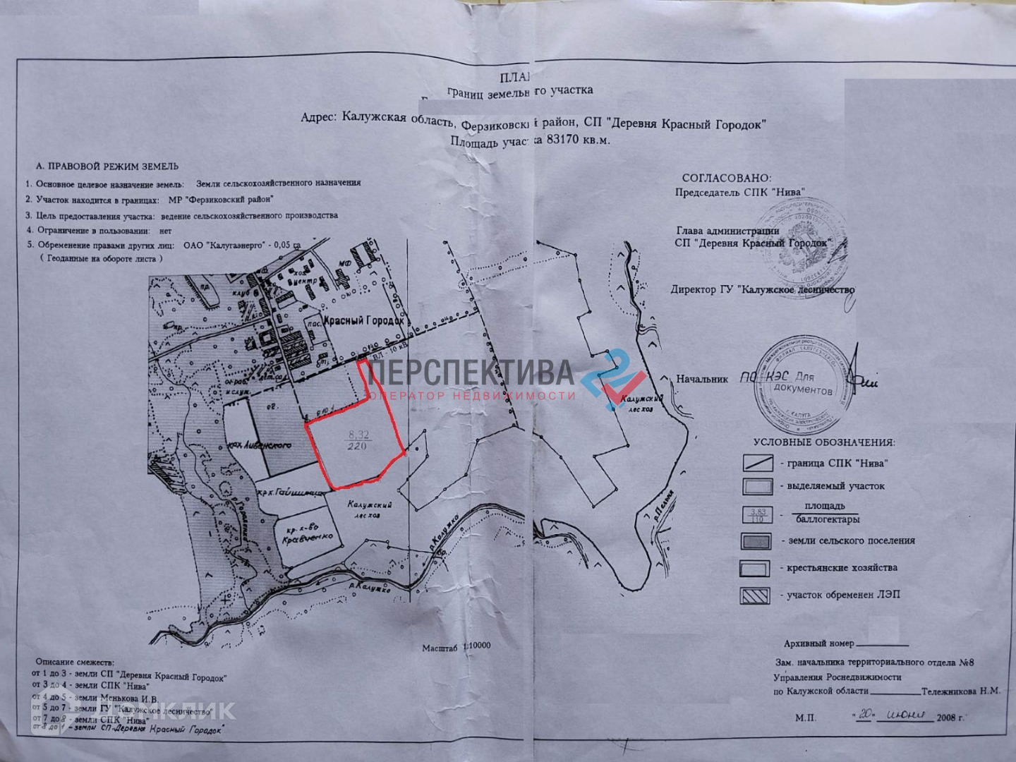 Продается участок сельскохозяйственного назначения 8,3га под КФХ, питомник, растениеводство, пасеку, родовое имение. Участок находится в д.Красный городок,  живописное место в 10 км к востоку от Калуги. Участок ухоженный, правильной формы на пологом склоне, расчищен от поросли. Хороший подъезд с 2х сторон, новая дорога. По нижнему краю участка протекает ручей, по правому краю находится сосновый бор, грибы, ягоды.  Электричество по краю участка, есть возможность приобретения смежных лпх/ижс участков в деревне. Красивейшие места!