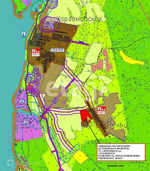 Находятся участки на расстоянии 90 км от Череповца, в окружении хвойного леса, на краю деревни Ручьи, Николо-Раменского С/C, Череповецкого района. Рядом находятся детские оздоровительные лагеря: Лесная сказка и Жемчужина Мологи. Это место идеально подходит для полноценного отдыха от городской суеты. Деревня жилая, спокойная, расположена в стороне от основной дороги, но в тоже время находится всего в 1,5 км от места, где река Молога соединяется с Рыбинским водохранилищем. Тут же находится замечательный песчаный пляж. Дома в деревне все ухоженные, много дачников, есть проживающие постоянно. Зимой дорога чистится. Расстояние до ближайших магазинов, медпункта и почты в деревне Харламовская всего 2 км. Хочется отметить, что верхние участки (на плане) начинают зарастать смешанным лесом. В основном это сосны и березки. Людям покупающим участок для отдыха, можно оставить часть леса и выгодно вписать планируемые постройки в существующий ландшафт.
