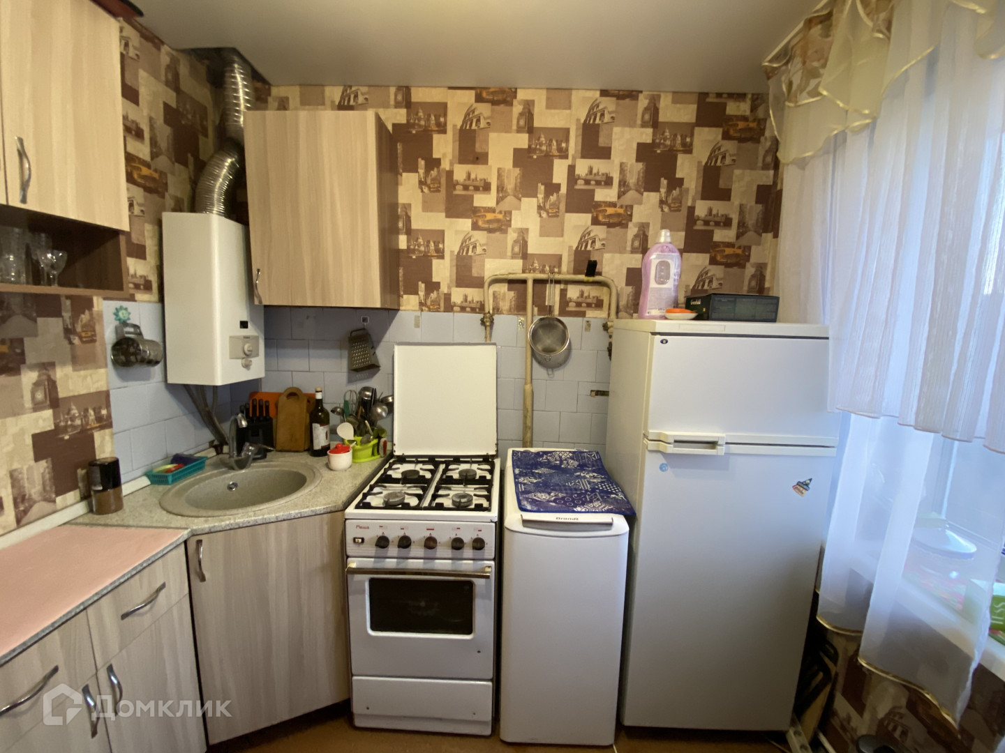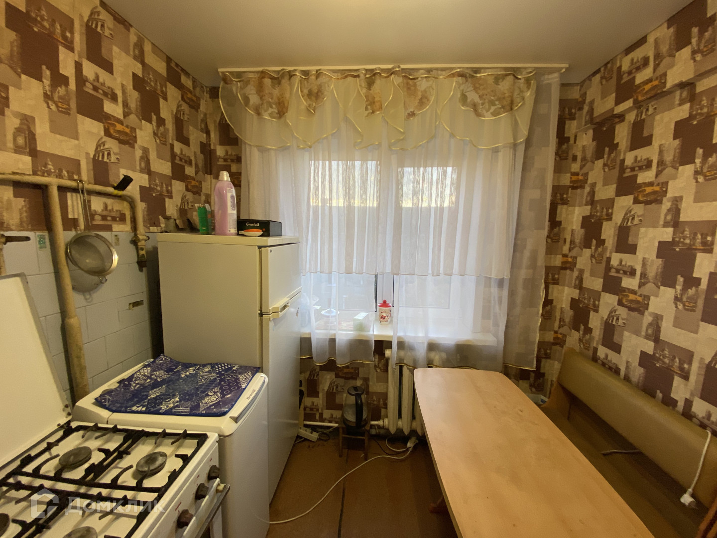 Установлен новый кухонный гарнитур, хорошая колонка, также остаются холодильник, стиральная машина, кухонный стол и диванчик.